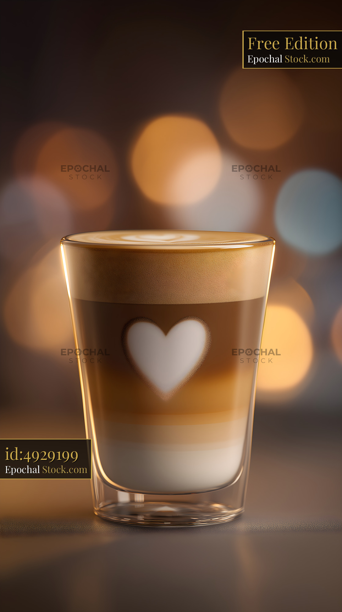 A coffee drink sits in a clear glass in a cozy space. The drink has a heart shape made of foam on top. Soft lights create a warm atmosphere in the background.