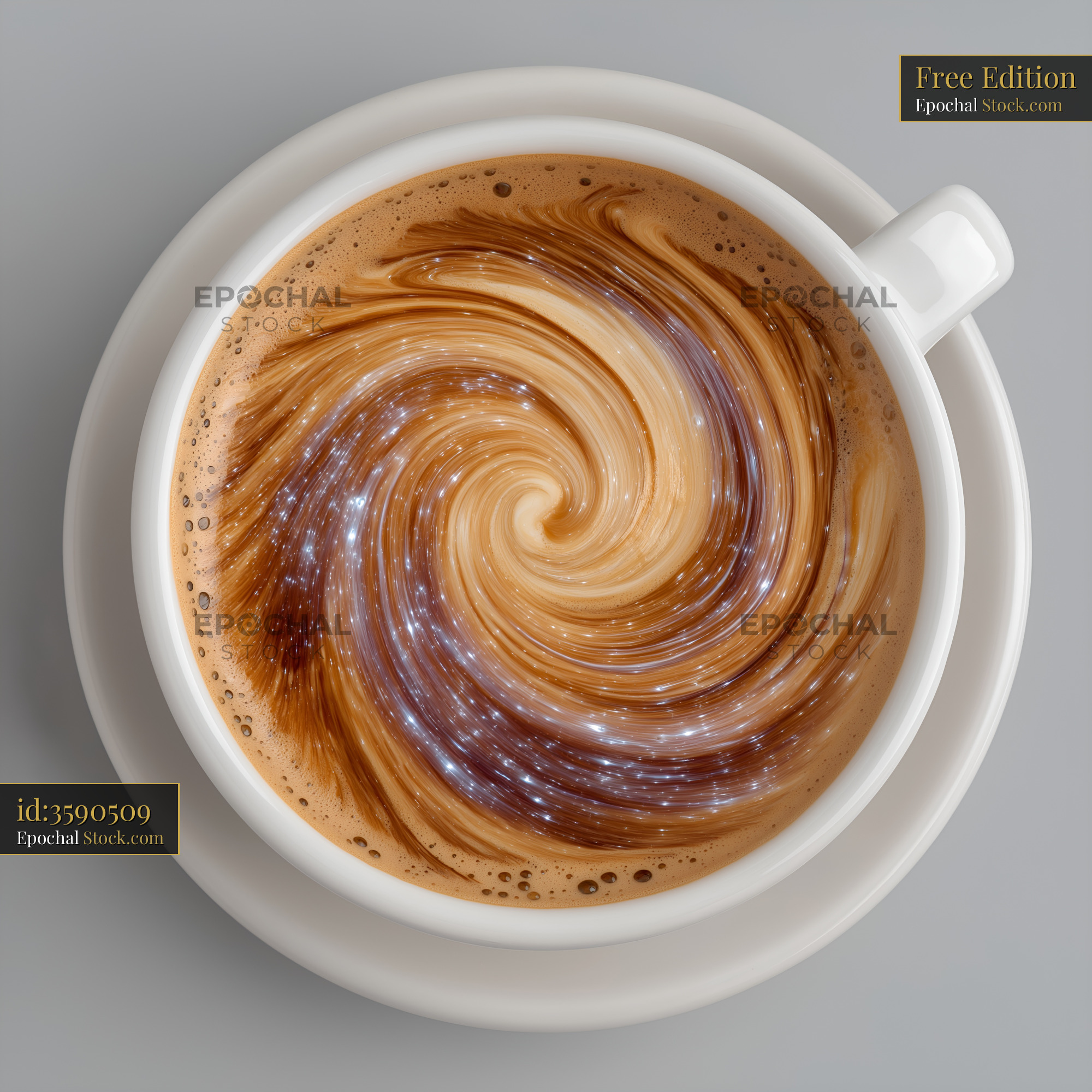 A cup of coffee sits on a gray table. The coffee has a spiral pattern made with cream and appears to contain stars. It looks inviting and warm.