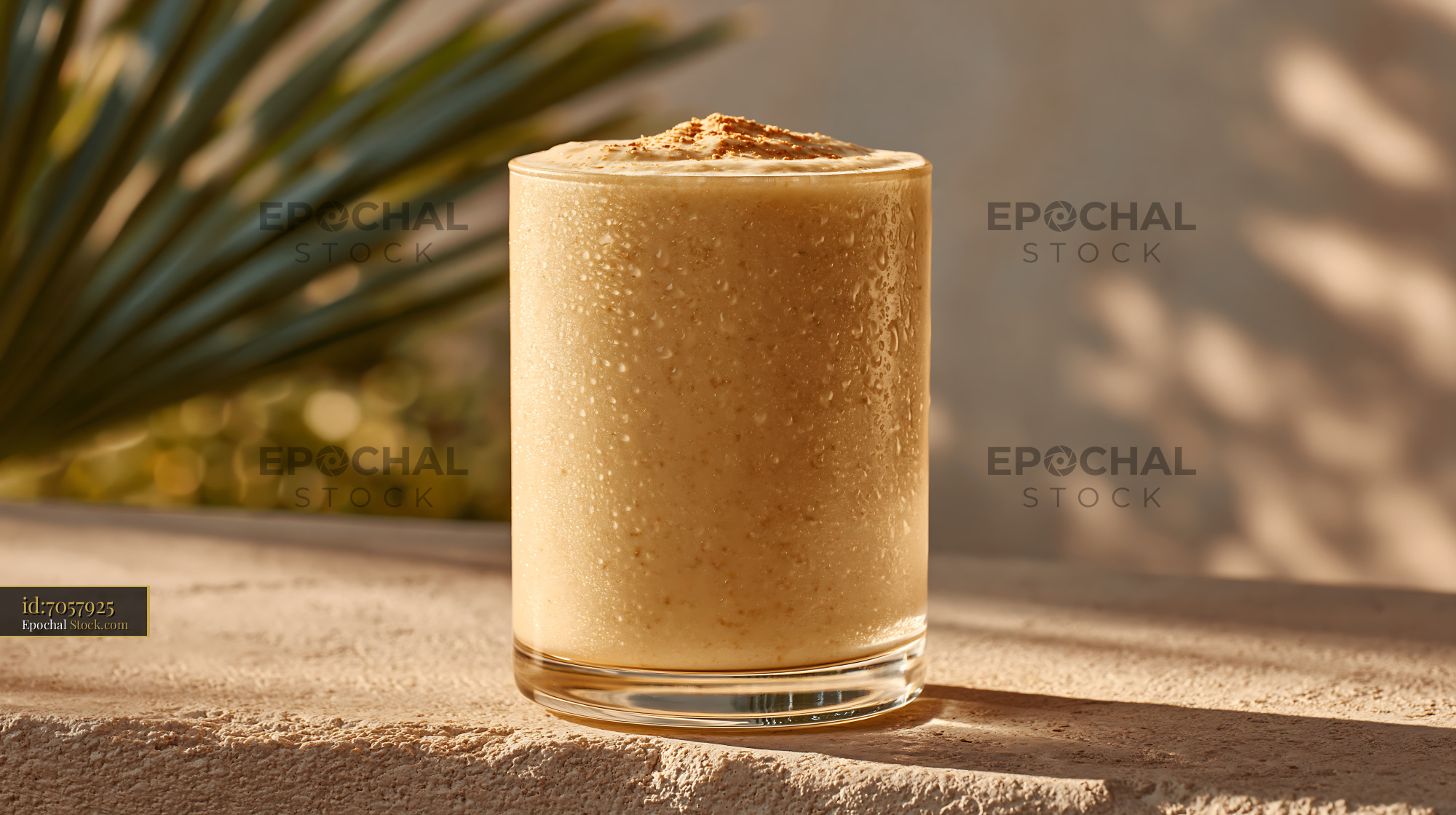Cold cloudberry cream milkshake in a glass on a sunny terrace
