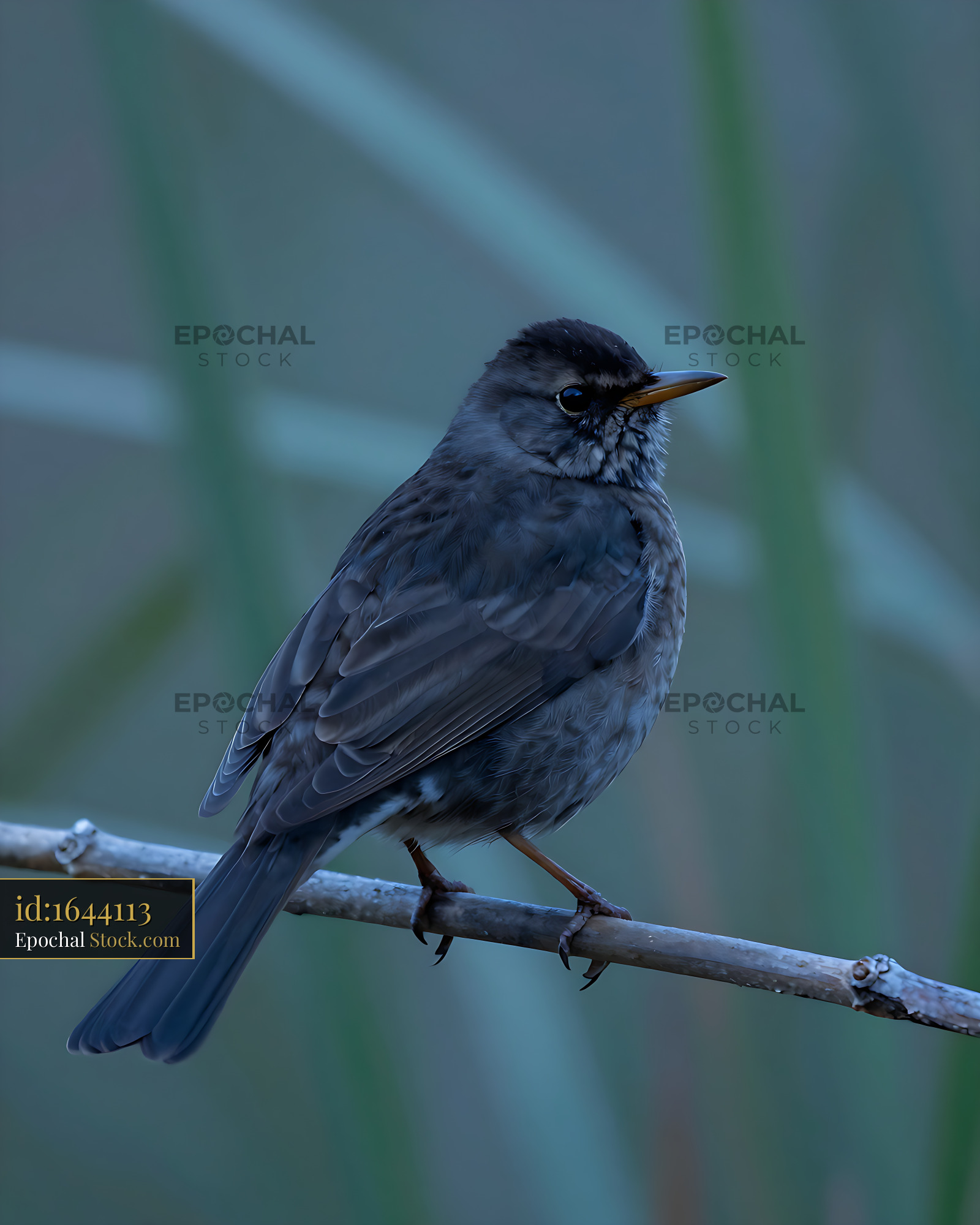 A common blackcap sits calmly on a slender twig against a soft blue background, capturing a peaceful moment of wildlife in the early morning stillness.