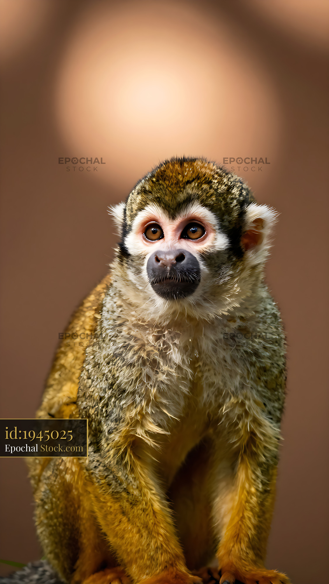 A close-up portrait of a squirrel monkey capturing a moment of quiet curiosity. The soft lighting and warm tones emphasize the animal's delicate features and soulful gaze.