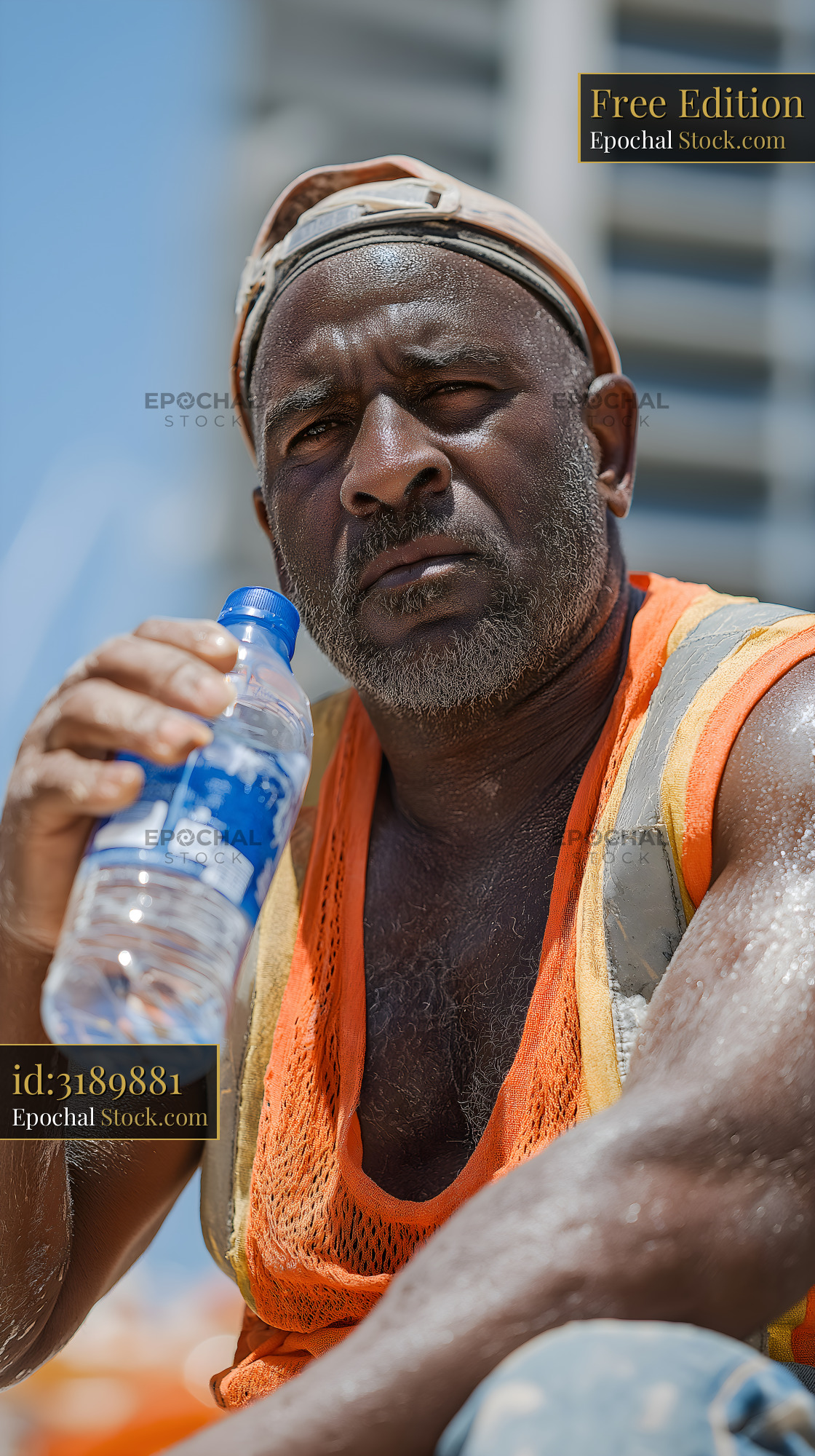 Construction worker takes a break to drink water at work site Free Premium Stock Image