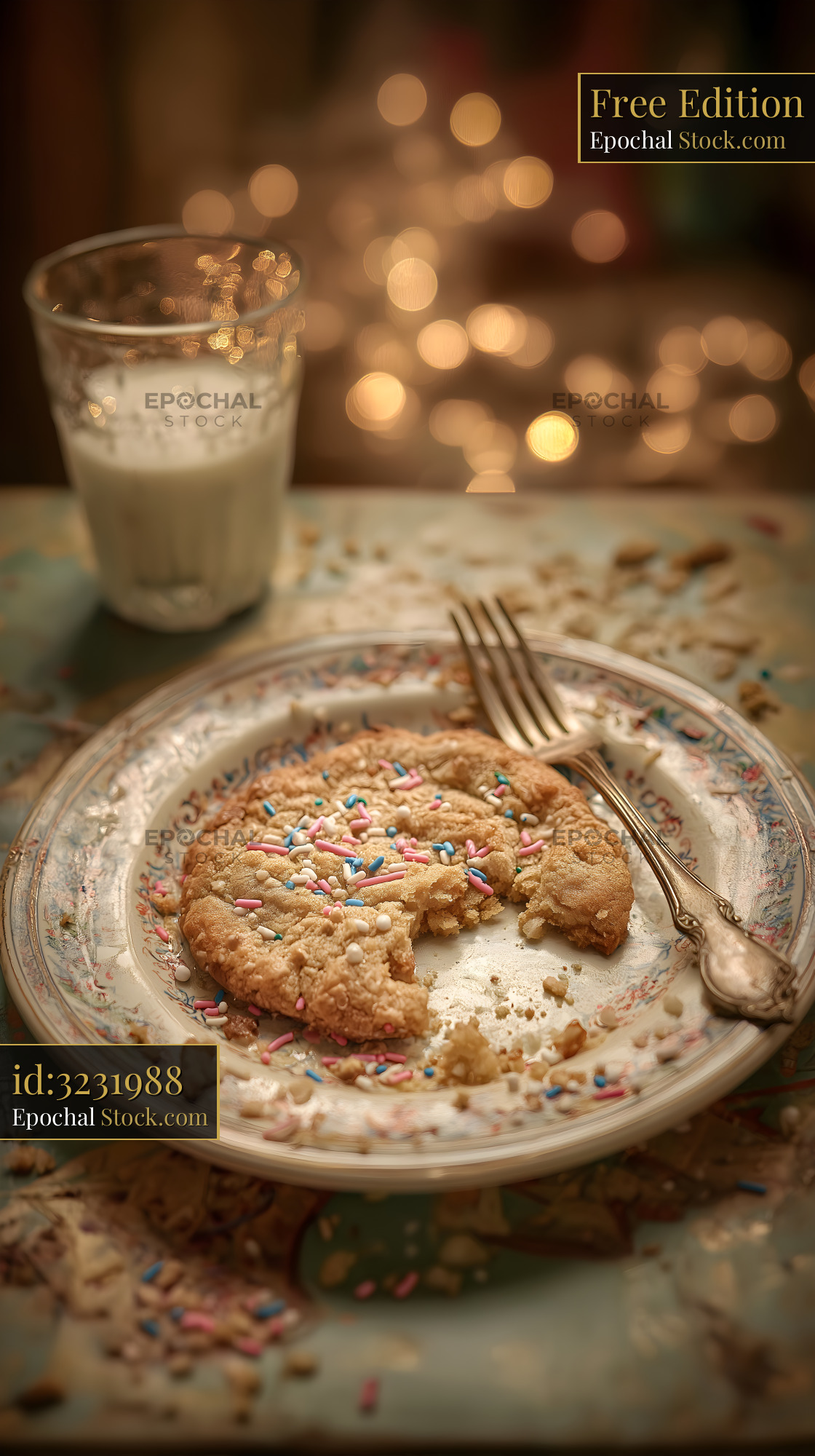 A plate with a half-eaten cookie covered in sprinkles sits next to a glass of milk. The setting shows a warm light glow in the background, suggesting a cozy atmosphere after dessert.