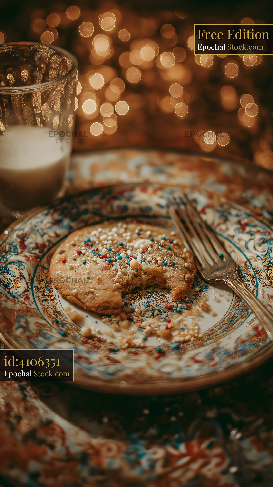 A chocolate chip cookie sits on a decorative plate with colorful sprinkles. A glass of milk is nearby. Soft lights create a warm setting. This scene shows a snack time moment.