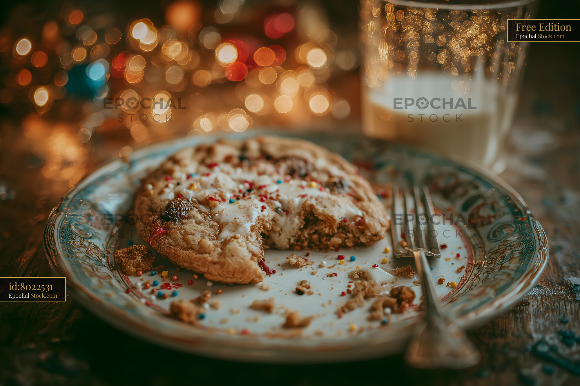 A cookie sits on a plate with colorful sprinkles. A glass of milk is next to it. Soft lights twinkle in the background, showing a festive atmosphere during a holiday gathering.