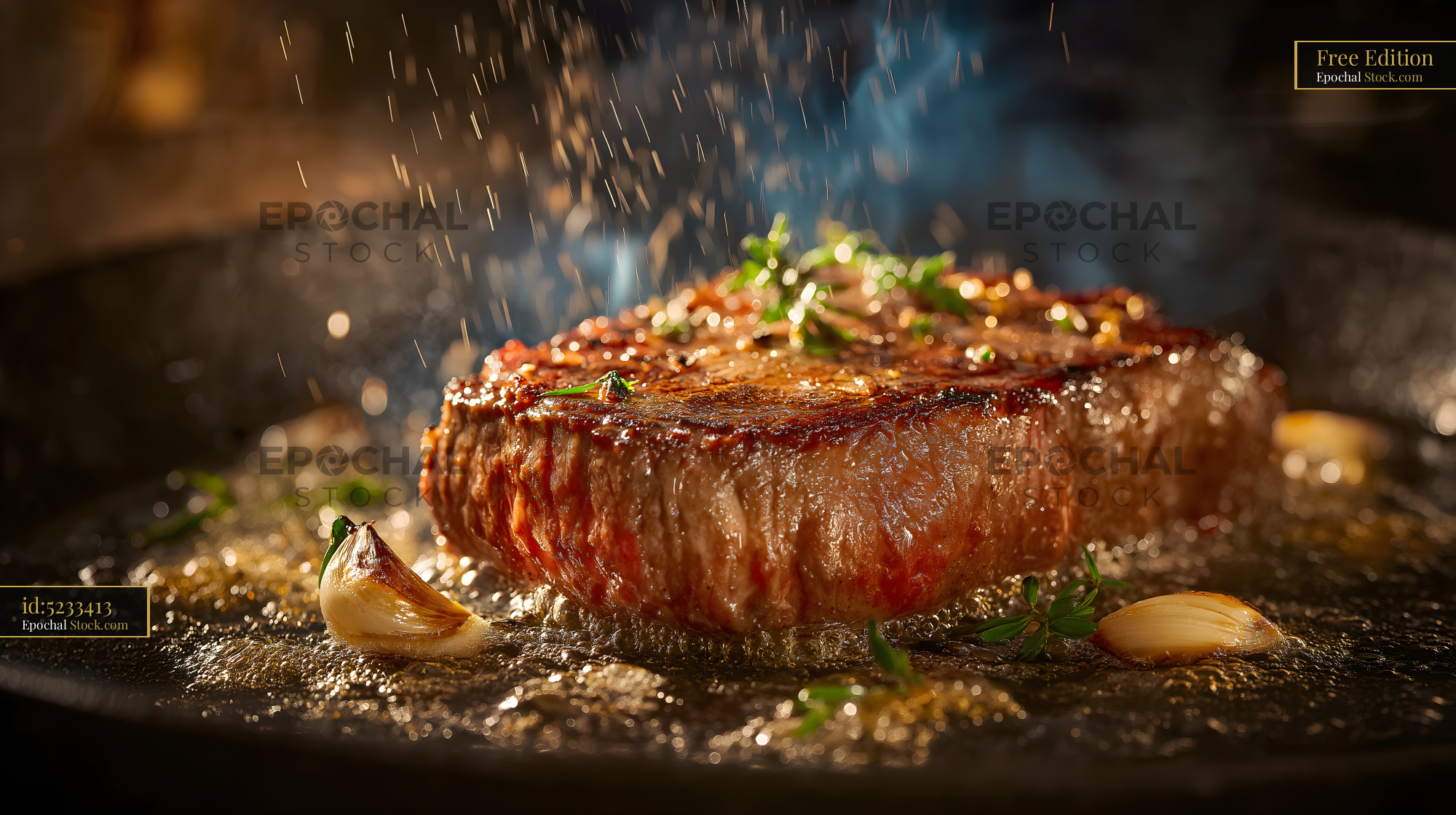 Cooking steak in skillet with herbs and garlic Free Premium Stock Photo
