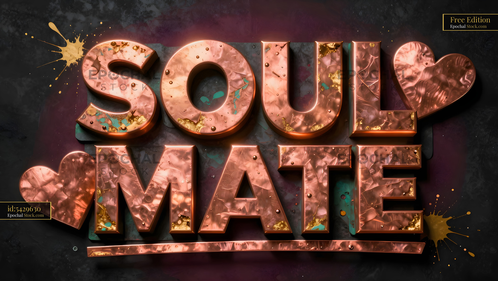 The design shows the words soul mate in shiny copper letters on a dark surface. The letters are detailed with splashes of color and a textured look, creating a striking visual impact.