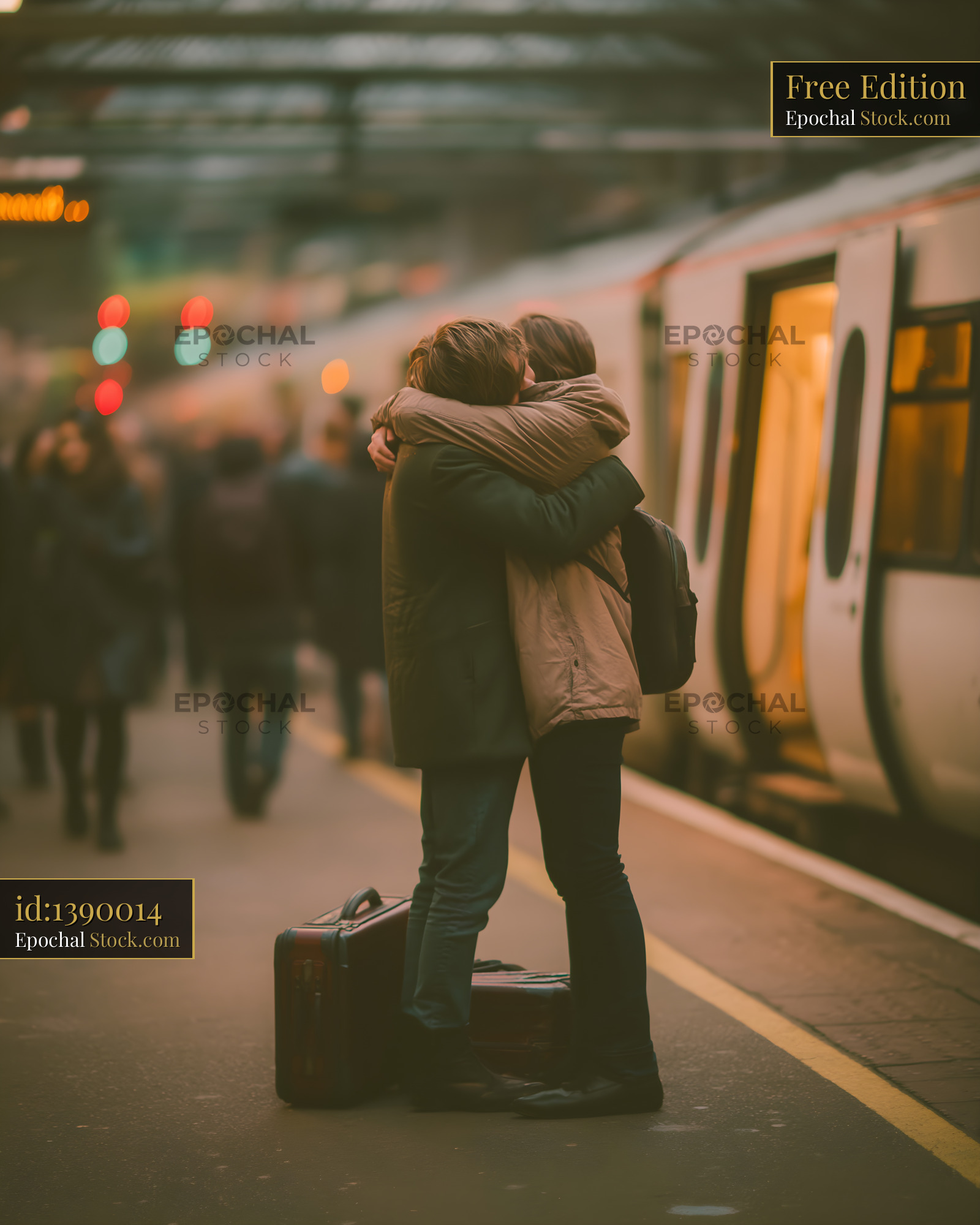 A couple hugs tightly at a train station. They stand on the platform with a suitcase beside them. Other travelers are nearby, and a train is approaching. It appears to be evening.