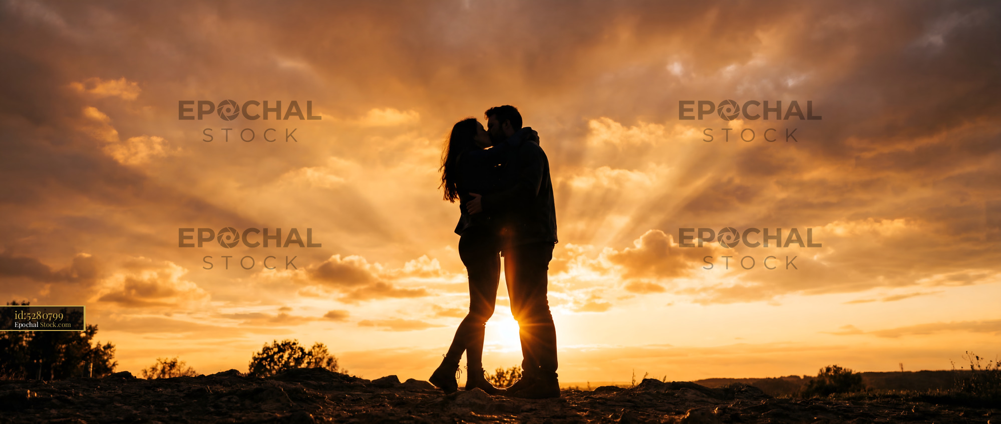 A couple stands on a hilltop and shares a kiss during sunset. Rays of light shine through clouds. The scene shows love and connection between the two people in the warm light.