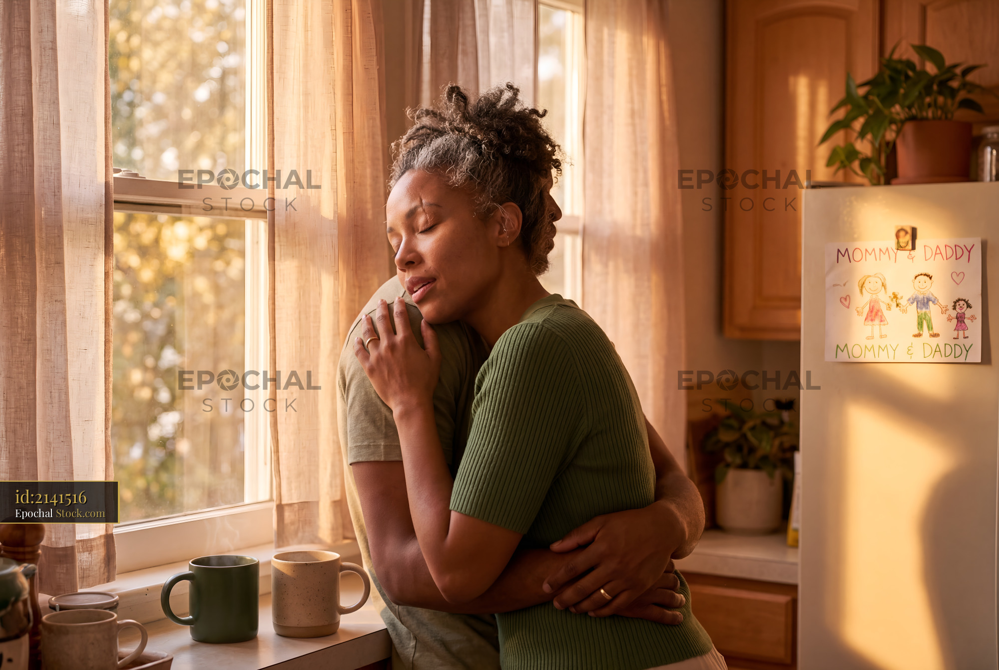 A couple shares a warm hug in their kitchen early in the morning. Sunlight enters through the window. They enjoy a moment of connection surrounded by home items.