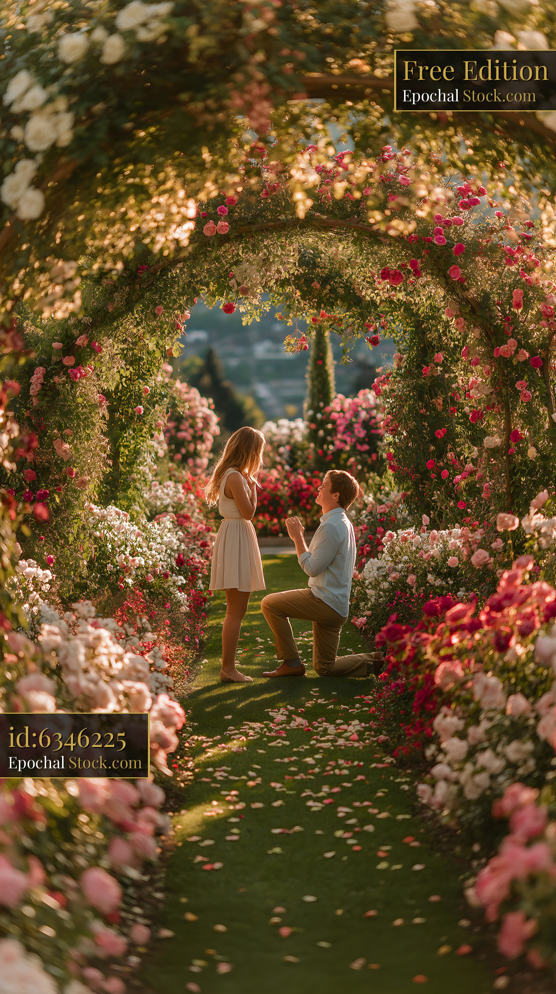 A man kneels on the grass and proposes to a woman in a flower garden. The scene is filled with colorful roses and arches of blooming flowers during sunset.