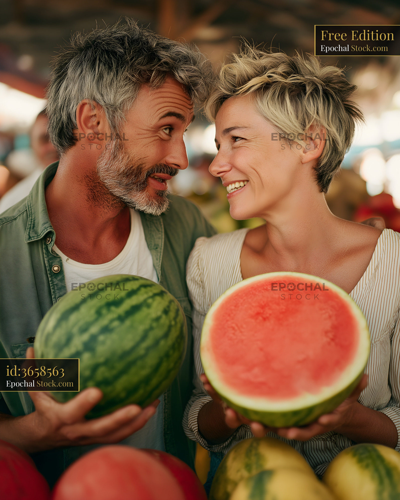 Two people stand together at a market, smiling at each other while holding whole watermelons. One person holds a cut watermelon, revealing red fruit inside.