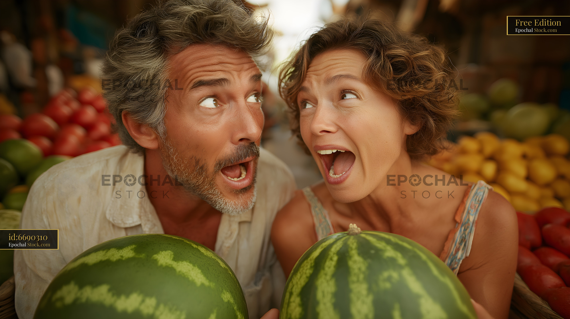 A couple holds large watermelons with big smiles. They stand in a vibrant market full of fruits. Their excitement adds to the lively atmosphere of the busy summer day.