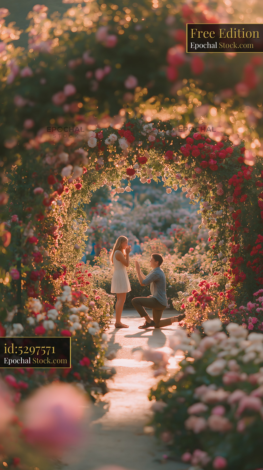 A man kneels to propose to a woman in a flower garden. Surrounding them are colorful roses and other flowers. The sunset casts warm light on the scene.