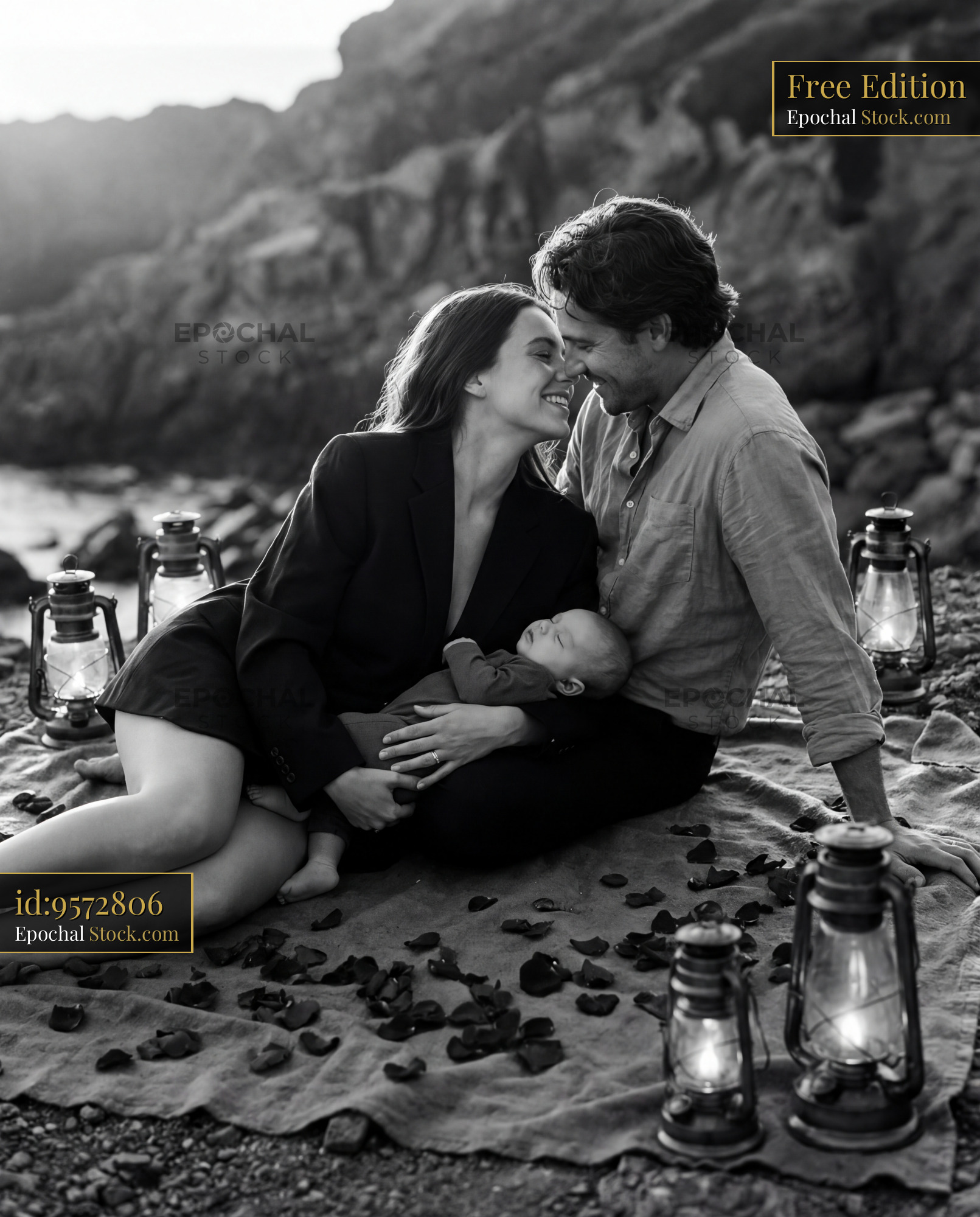 A couple sits on a blanket by the beach, smiling at each other while holding their baby. Lanterns surround them, and rocky cliffs form the backdrop at sunset.
