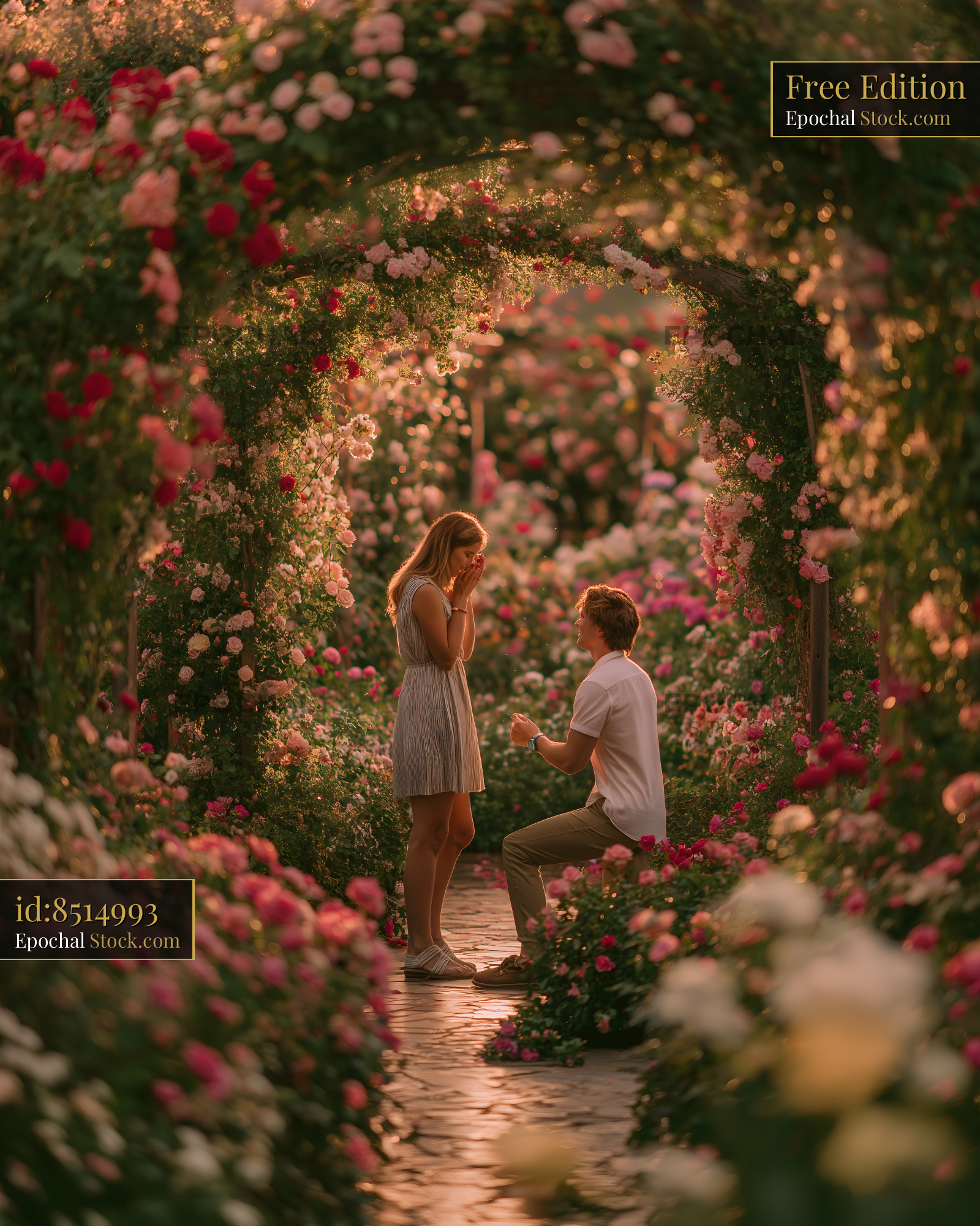 Couple enjoys proposal in rose garden at sunset Free Premium Stock Photo