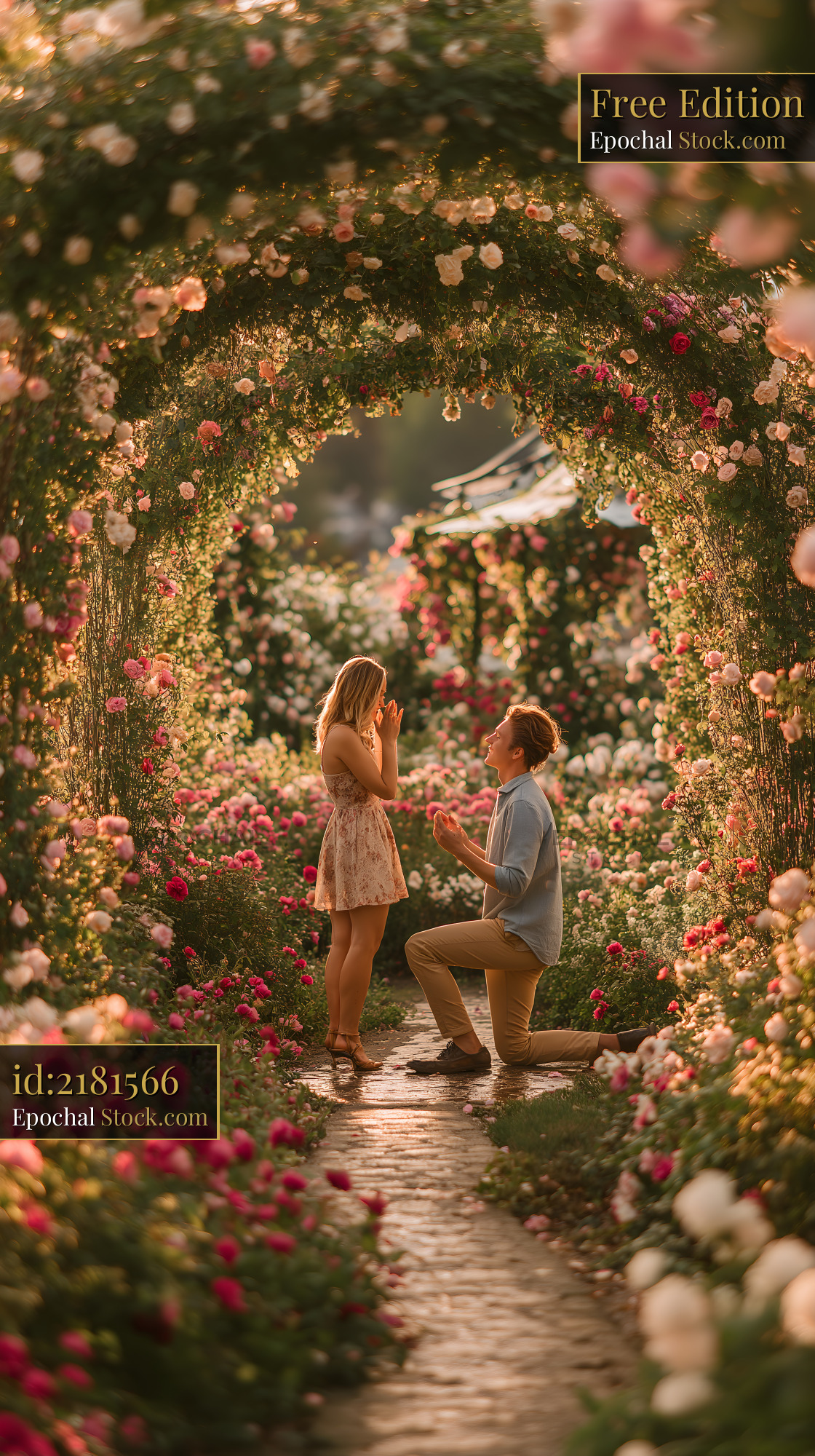 Couple has proposal in a flower garden in the evening light Free Premium Stock Photo