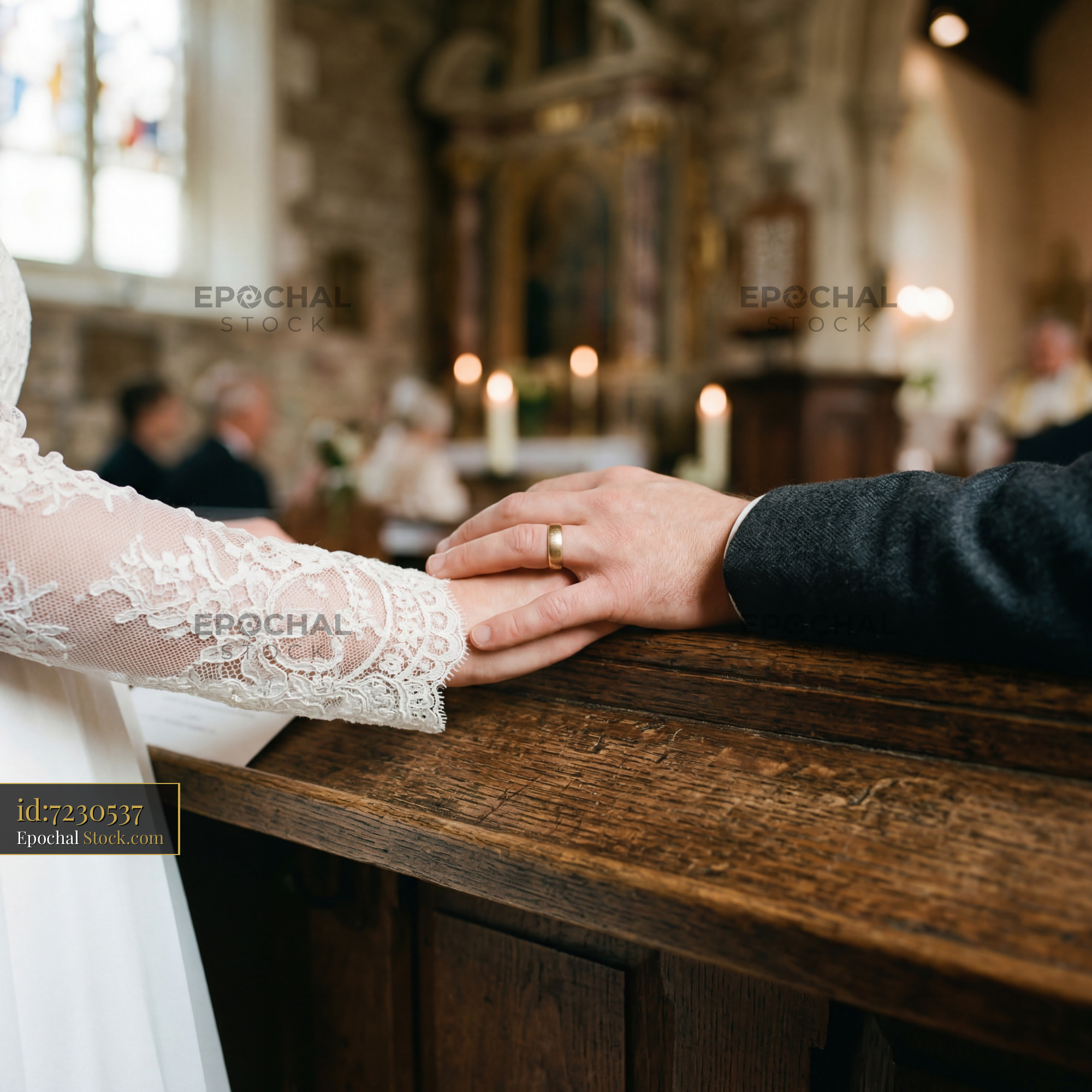 Couple holds hands during wedding ceremony in a church Premium Stock Photo