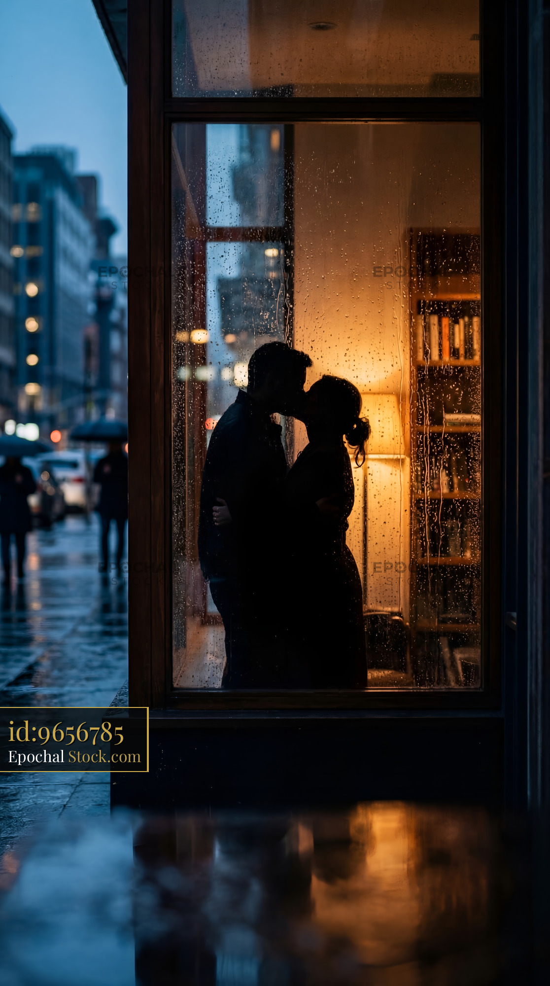 A couple shares a kiss inside a warm room while rain falls outside. The scene shows the city streets through the glass and soft light from a lamp. People walk by in the rain.