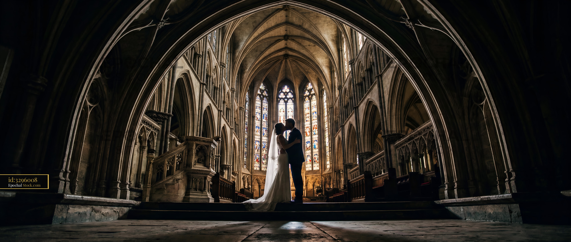 A couple stands in a church with tall arches and stained glass windows. They kiss in a moment of joy. Light fills the space, showing the details of the architecture. It is their wedding day.