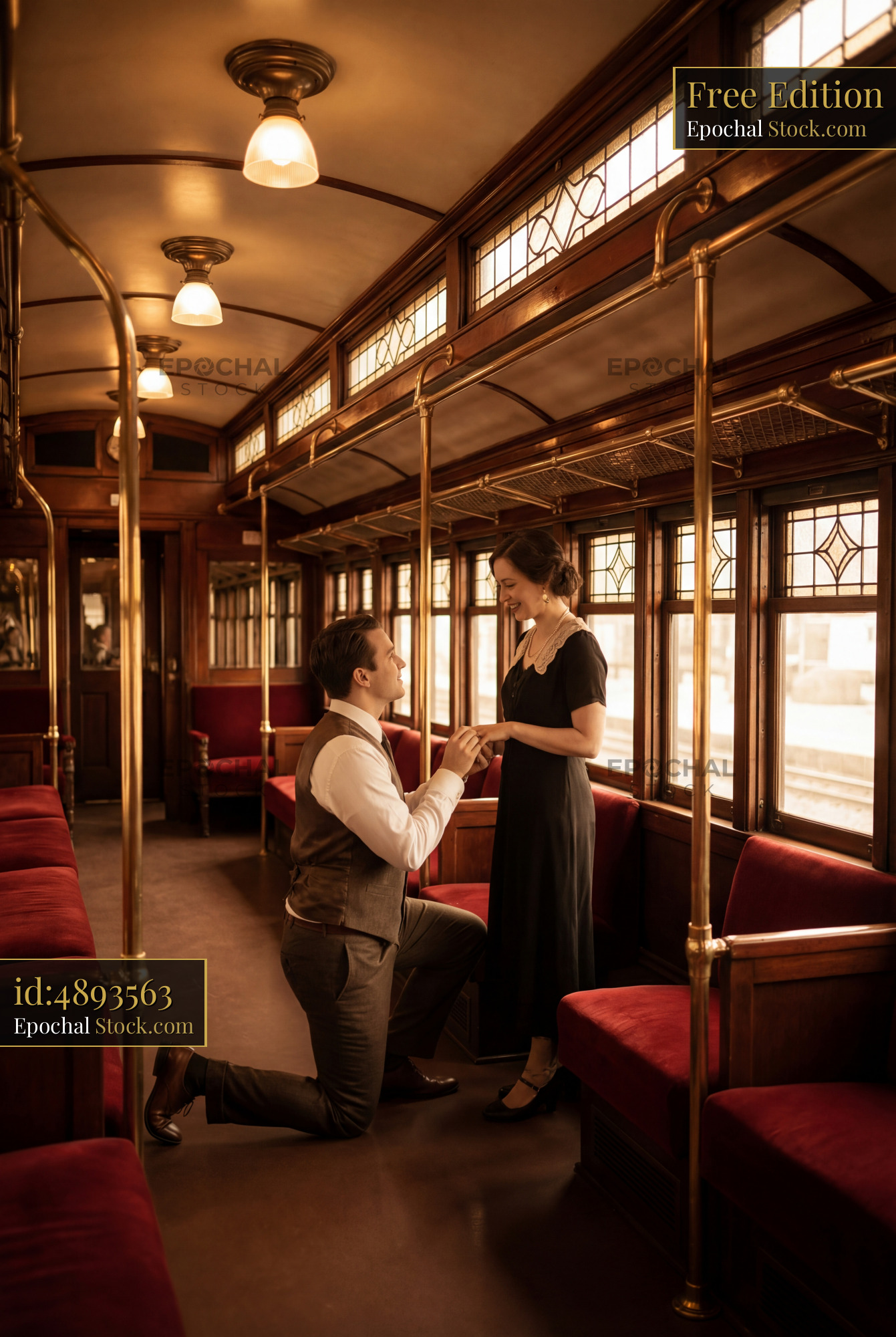 A man kneels and proposes to a woman inside a vintage train. They are surrounded by red seating and brass details. Natural light fills the space, creating a warm atmosphere.