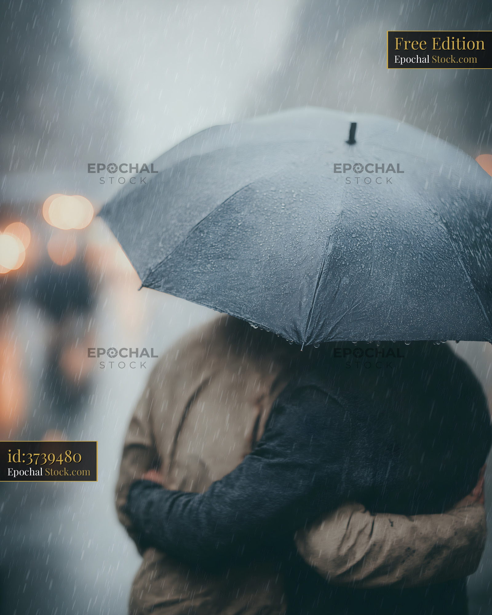 Couple shares an umbrella while hugging in the rain Free Premium Stock Photo