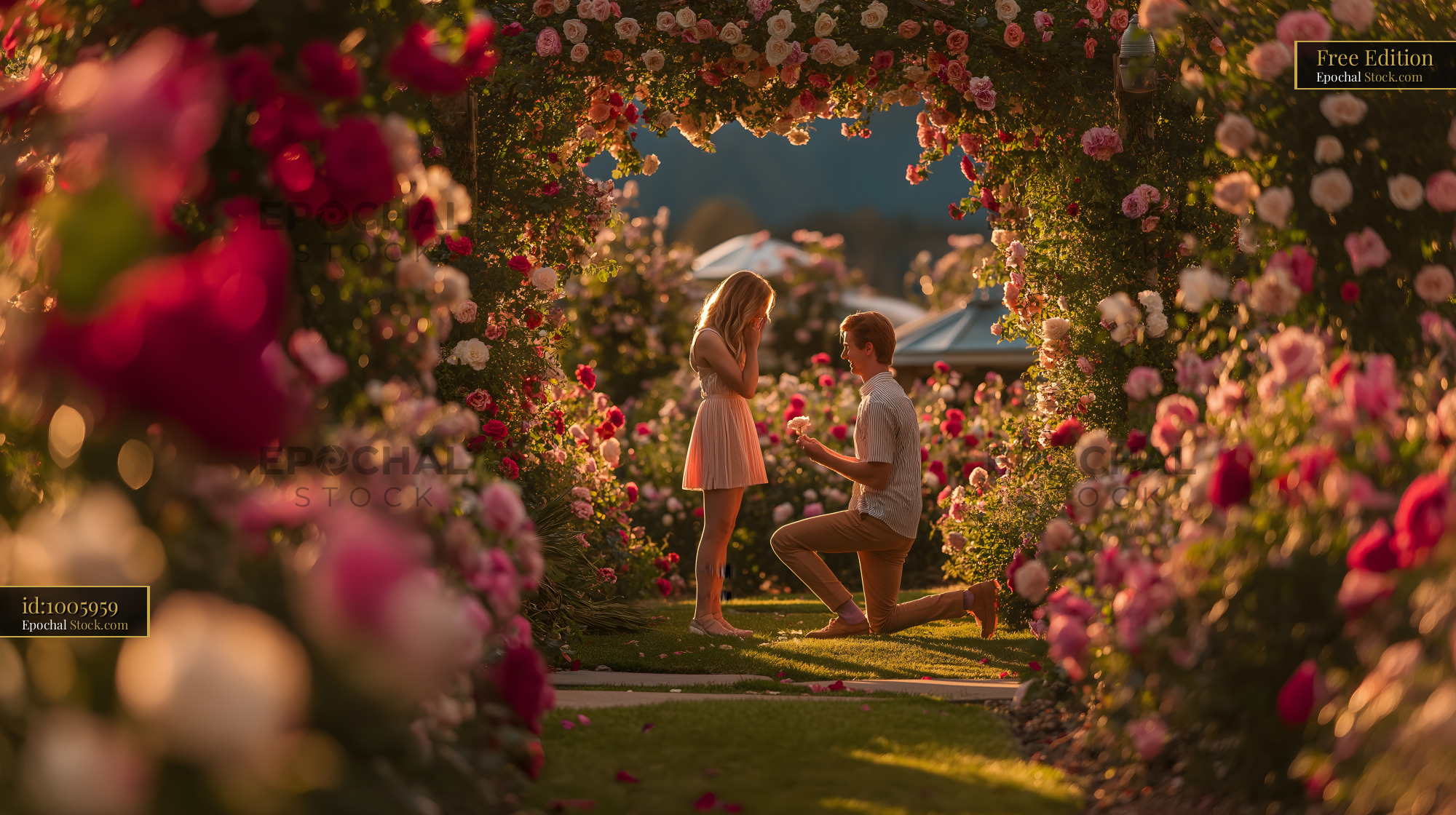 Couple shares important moment in rose garden during sunset Free Premium Stock Image