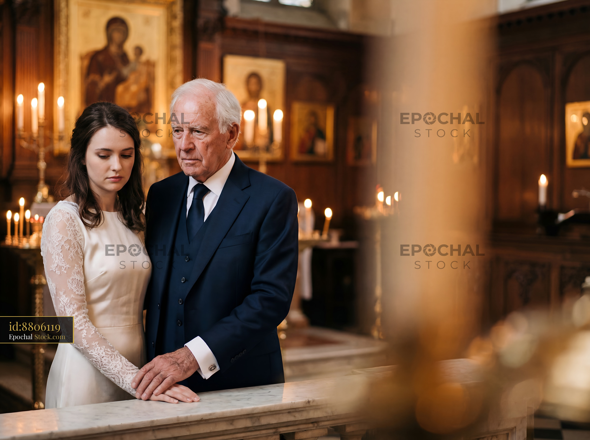 A couple stands side by side inside a church. The woman wears a white dress while the man is in a dark suit. Candles are lit around them, creating a warm atmosphere as they connect.