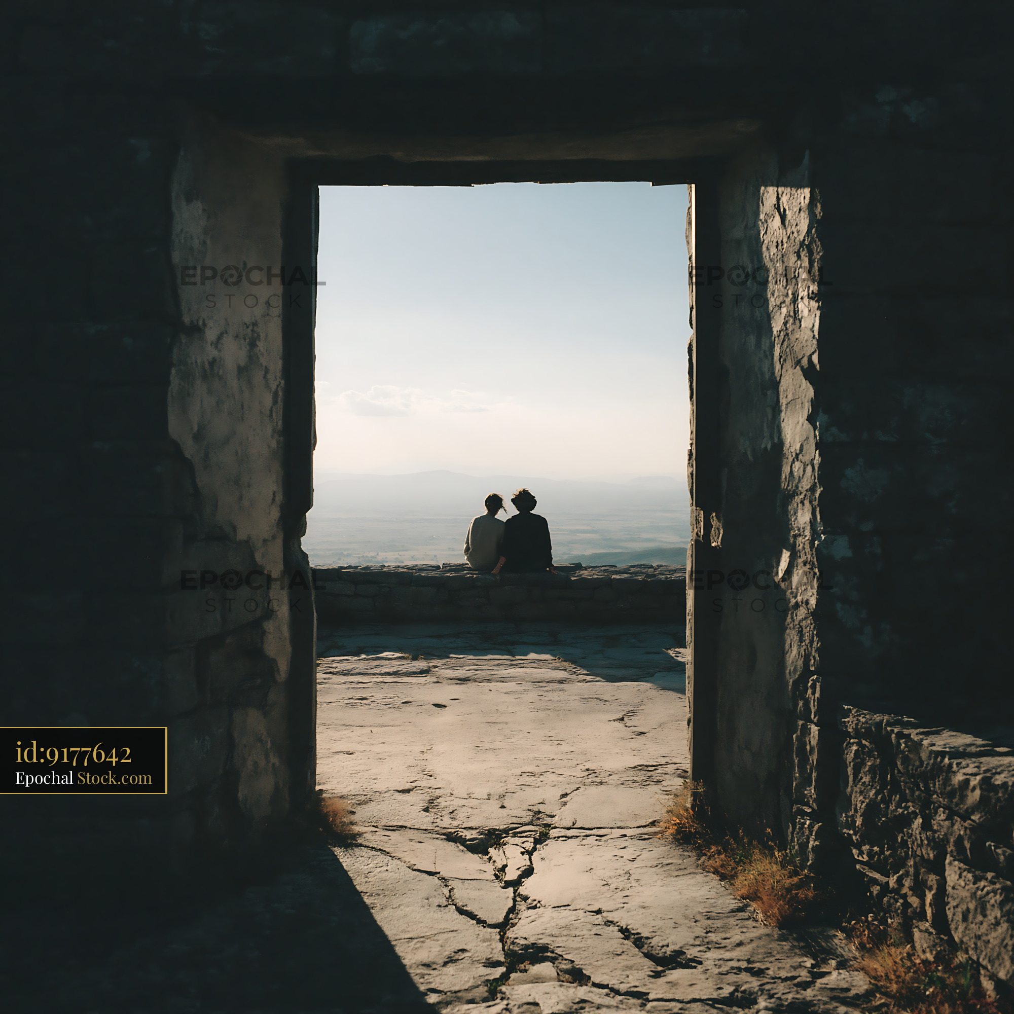 A young couple sits together on an ancient stone wall, framed by a weathered doorway, gazing at a misty valley at sunset, evoking themes of connection and shared discovery.