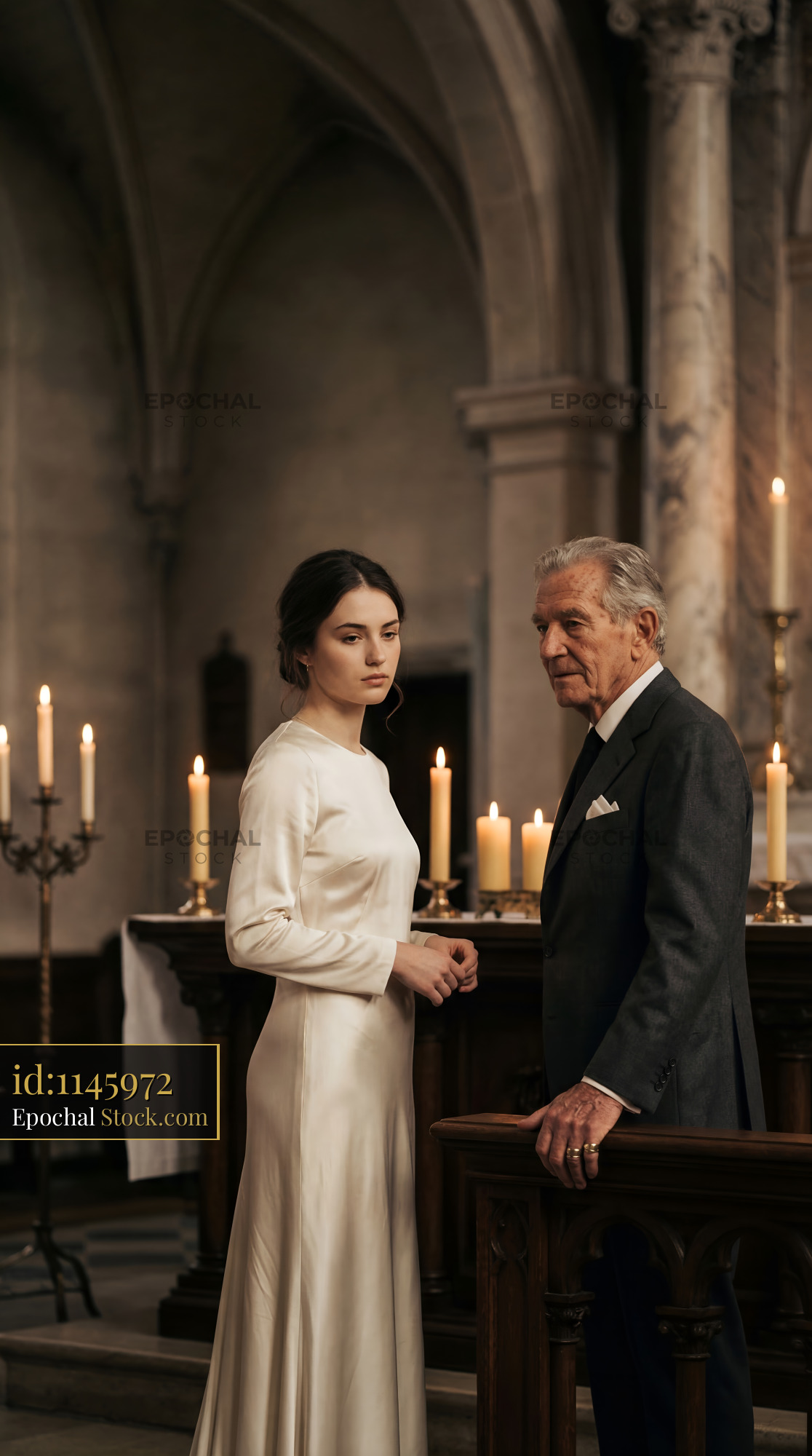 A man and a woman stand together near the altar in a church. Candles are lit around them. The setting is dimly lit, creating a solemn atmosphere. They appear engaged in conversation.