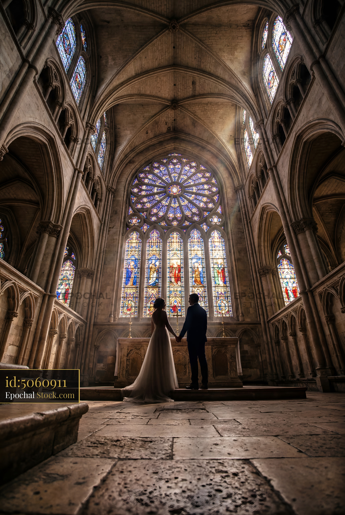 Couple stands hand in hand in a historic cathedral at dusk Premium Stock Photo
