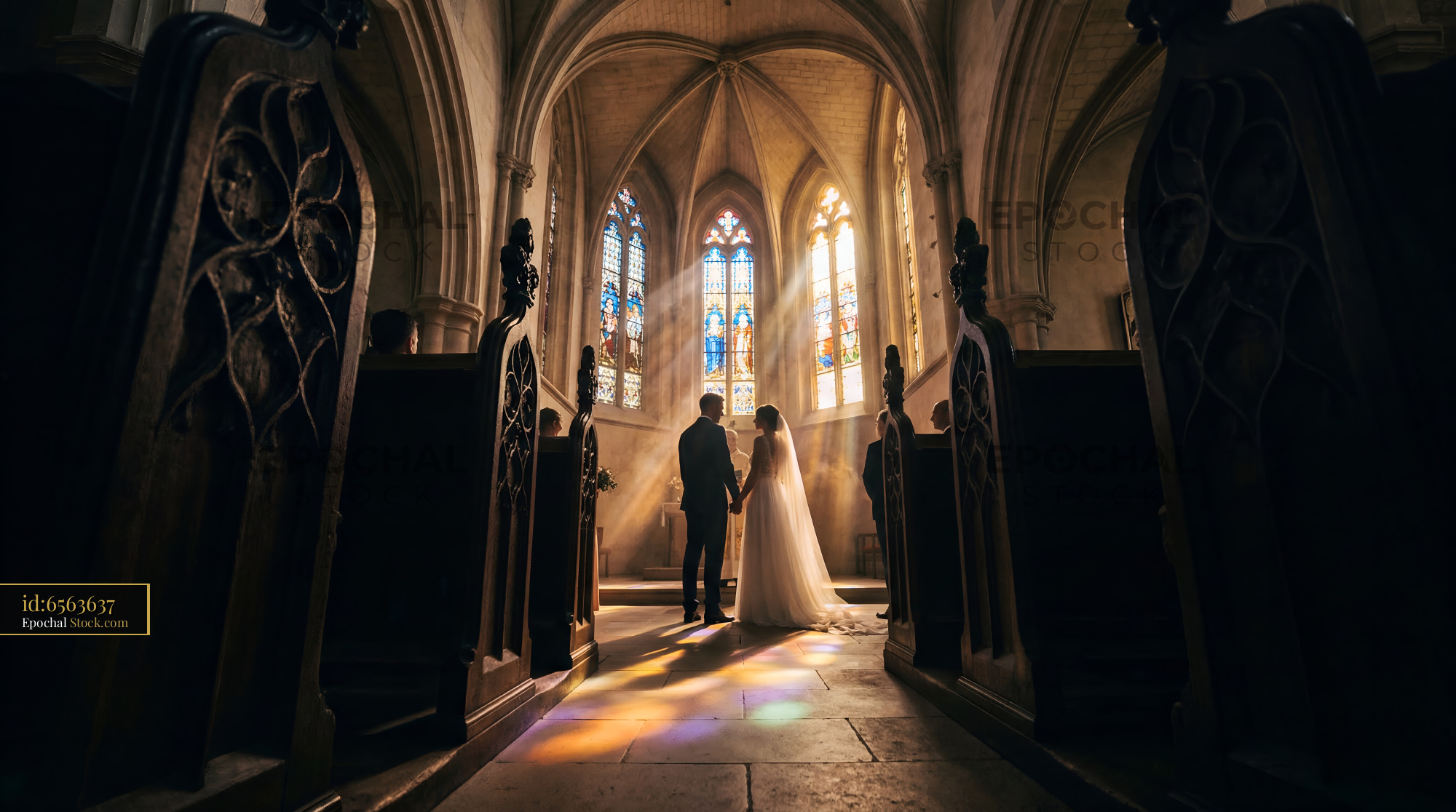 Couple stands in church with sunlight filtering through windows Premium Stock Image