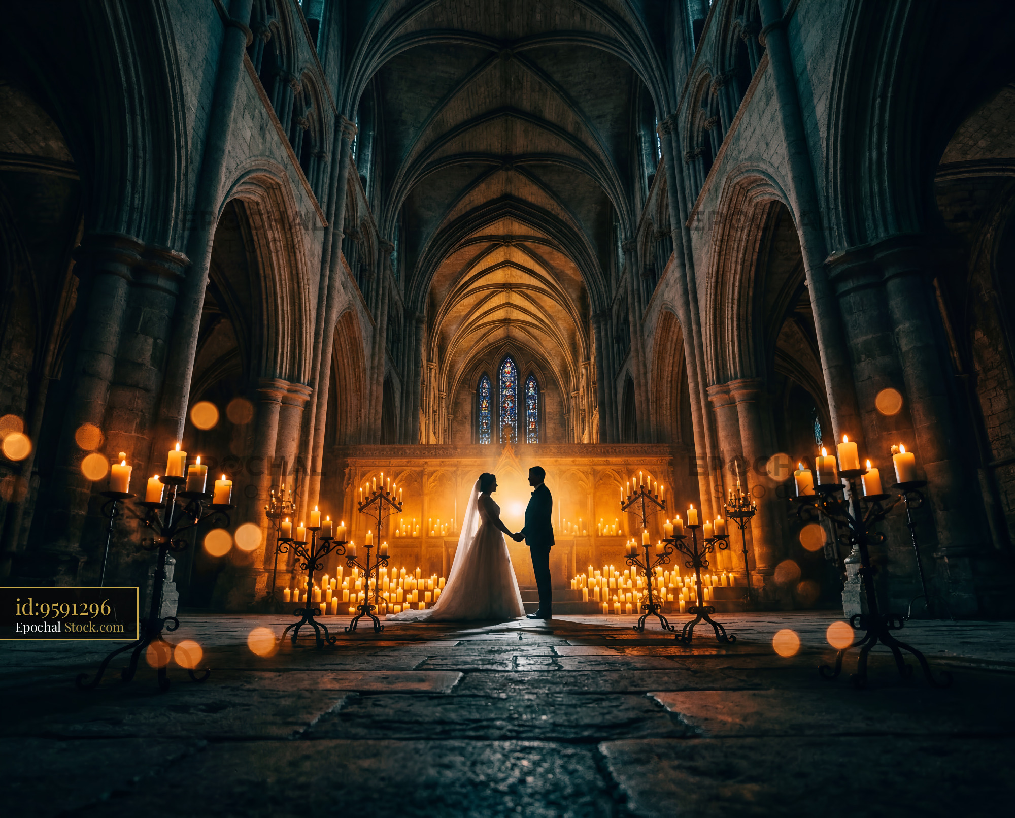 A couple holds hands in a large, candlelit space. They stand in front of many candles, surrounded by tall arches and a soft glow. This moment captures love and commitment in a special location.