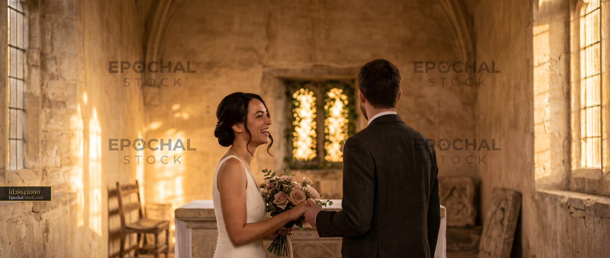 A couple smiles at each other in a historic chapel. Sunlight shines through the windows as they hold hands. The scene is joyful and intimate, highlighting their love.