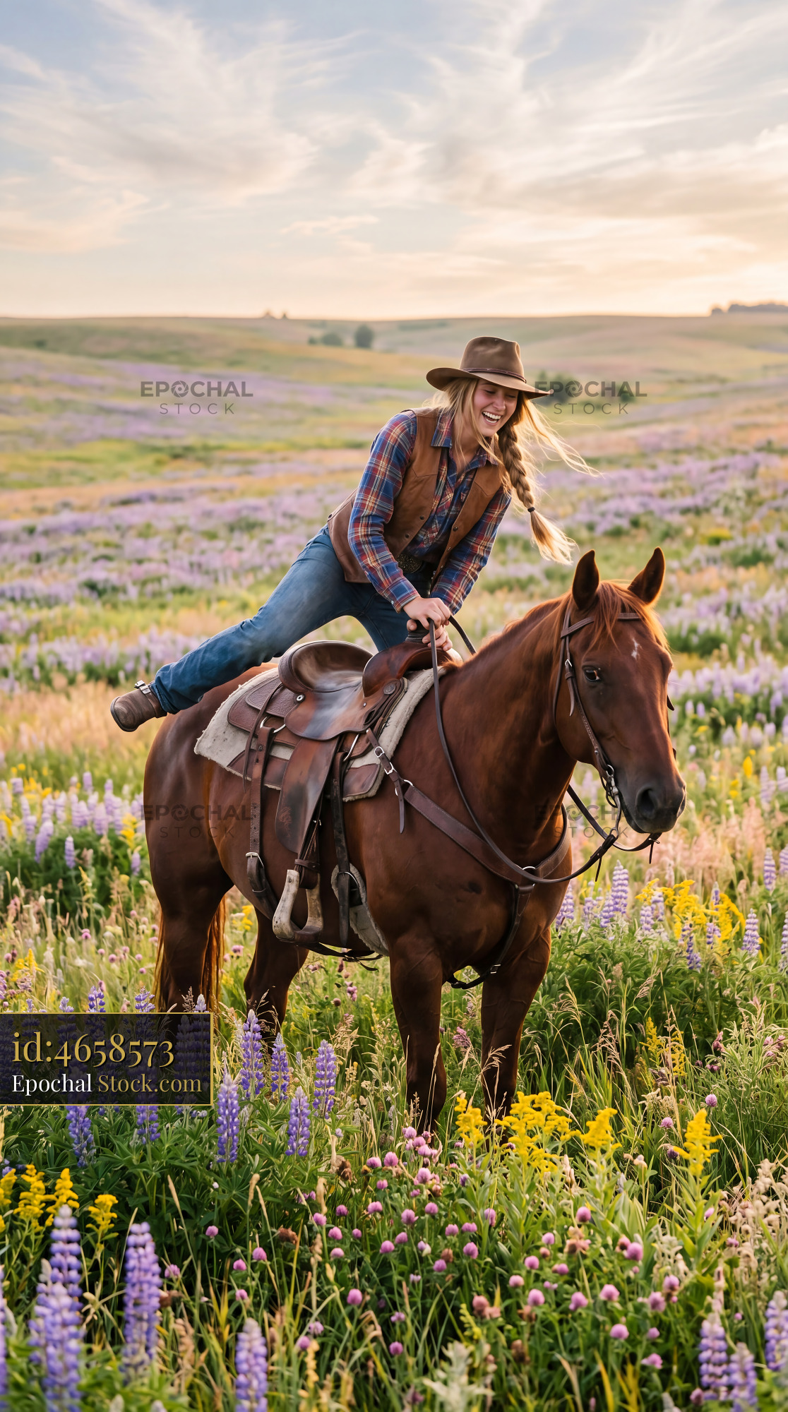 Cowgirl & Chestnut Horse in Wildflower Meadow