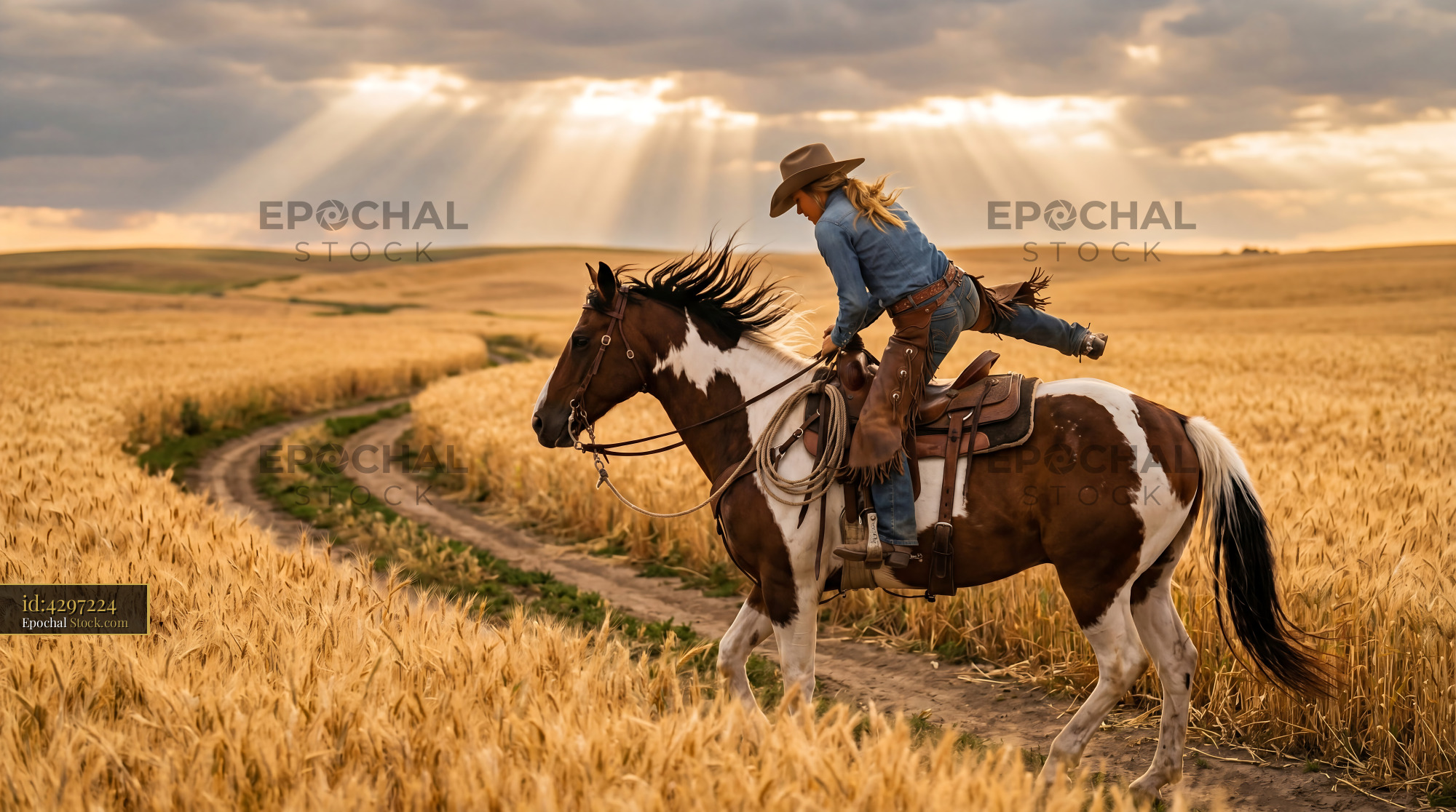 Cowgirl Mounting Pinto Horse in Golden Wheat Field