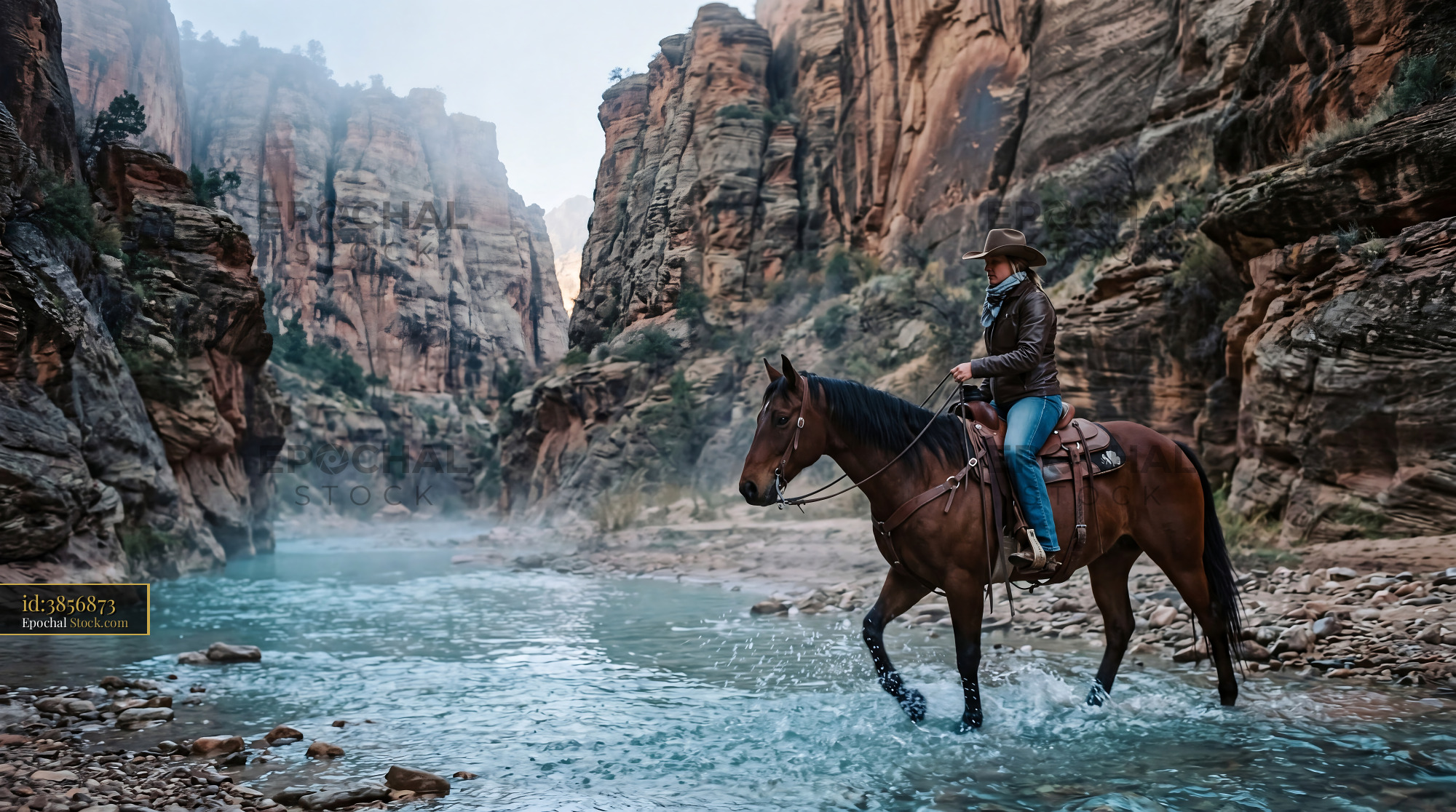 Cowgirl Riding Bay Horse in Turquoise Canyon