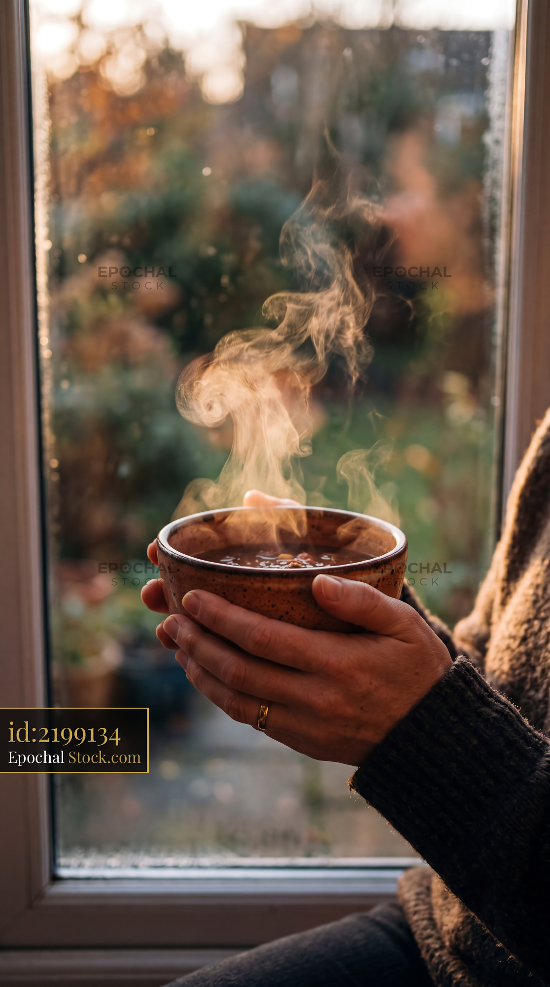 A warm, atmospheric scene of a steaming bowl held in golden rimlight. Ideal for cozy kitchen linens, rustic cafe wallpaper, and seasonal home decor projects.