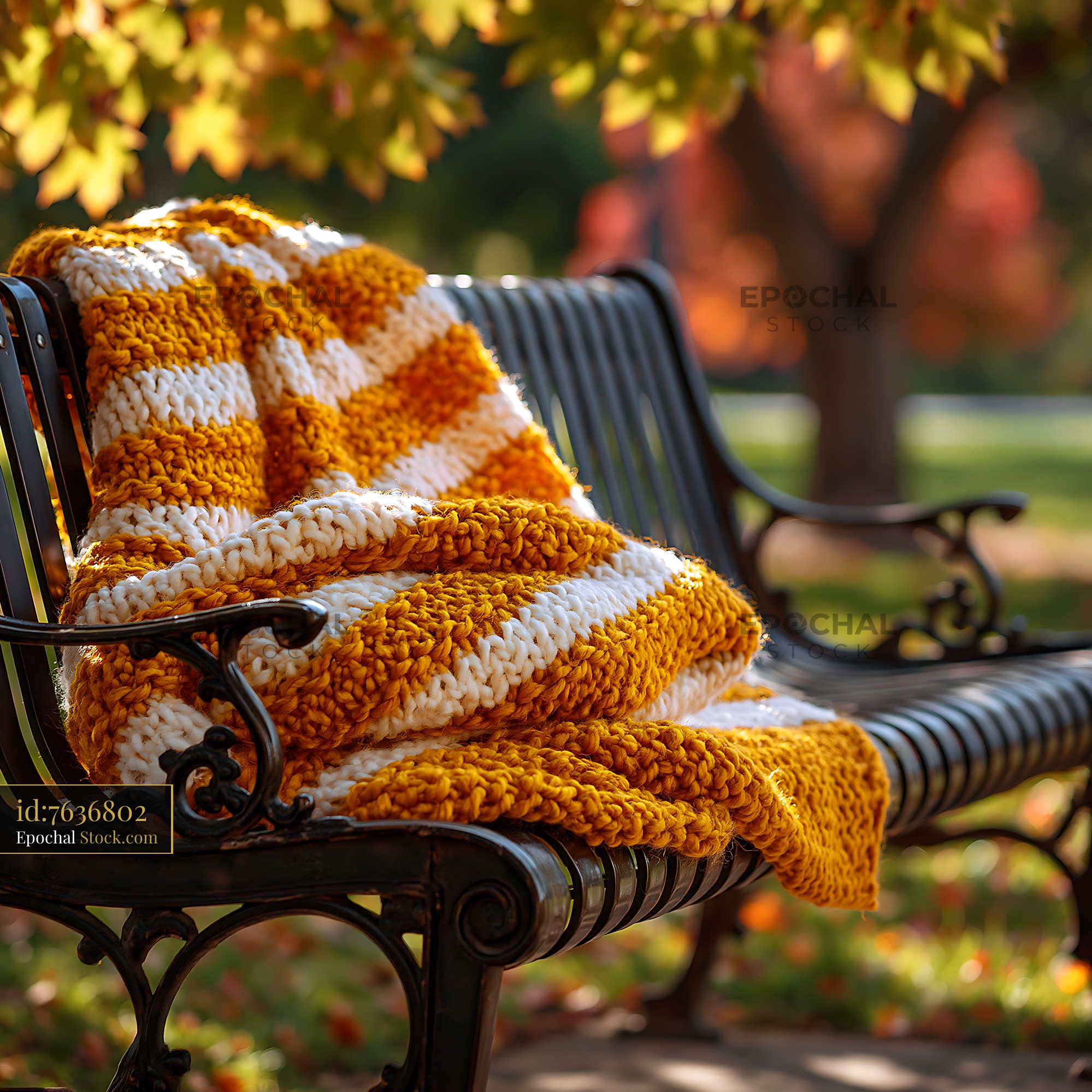 A yellow and white striped throw on a park bench surrounded by golden autumn foliage and soft sunlight, evoking feelings of warmth, seasonal comfort, and peaceful solitude.