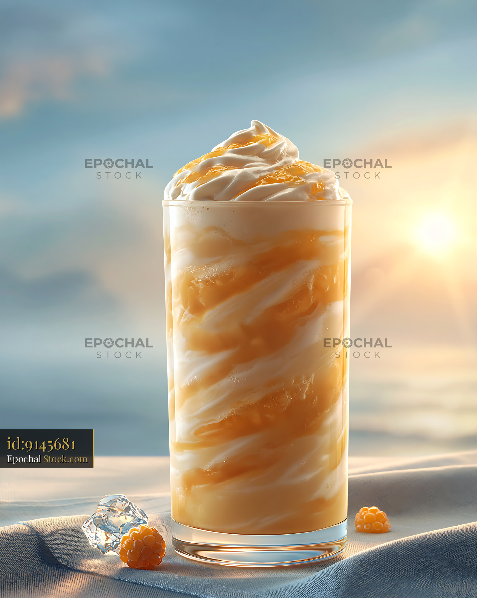 A refreshing cloudberry cream milkshake with whipped cream and syrup, set against a serene coastal sunset, evoking themes of summer luxury, relaxation, and indulgence.