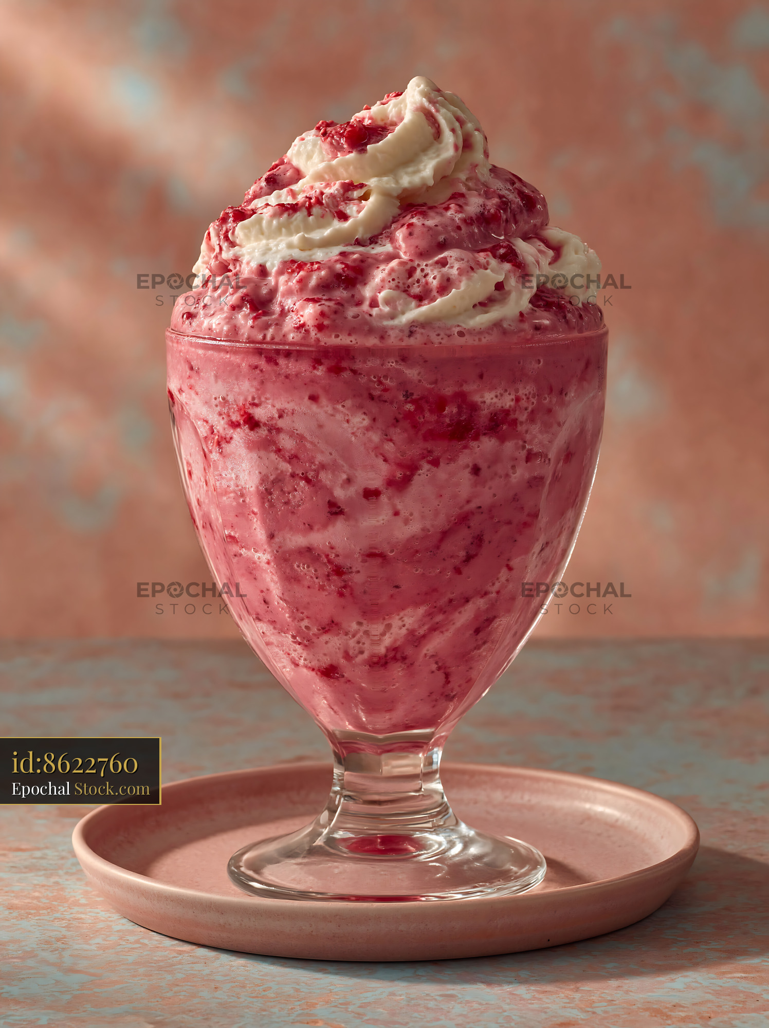 A refreshing rose cardamom milkshake topped with swirls of cream and syrup, capturing the essence of exotic floral flavors and sweet indulgence on a warm afternoon.