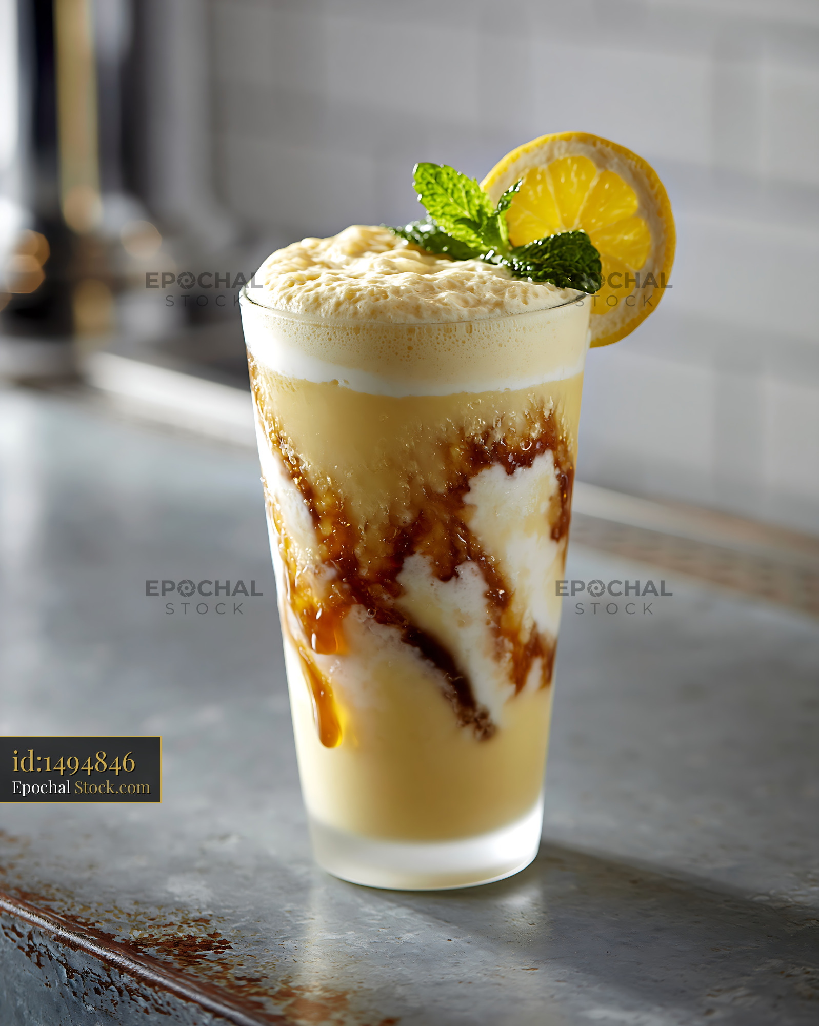 Creamy yuzu honey smoothie with foam and mint on a rustic counter