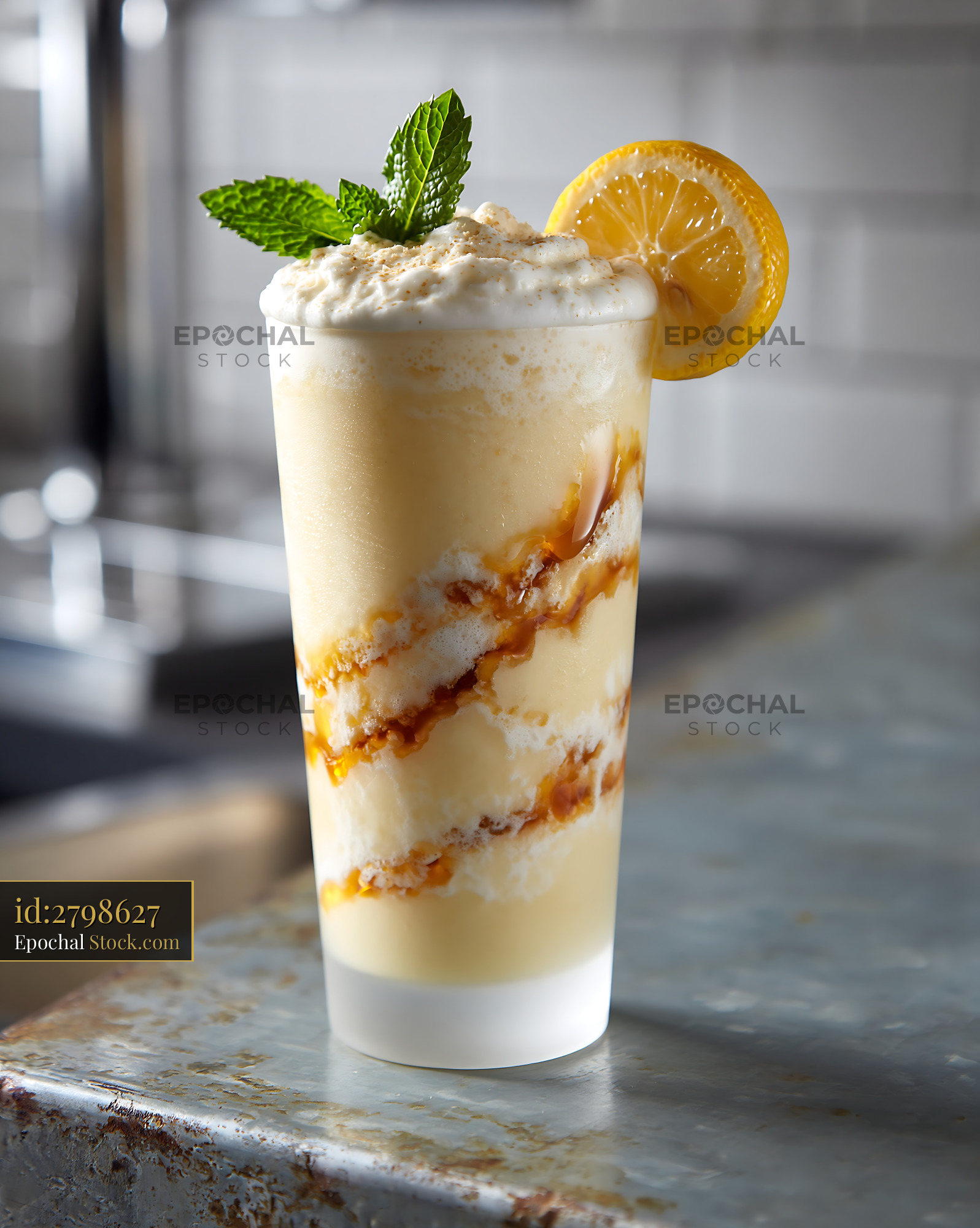 Creamy yuzu honey smoothie with mint and lemon on a rustic metal count