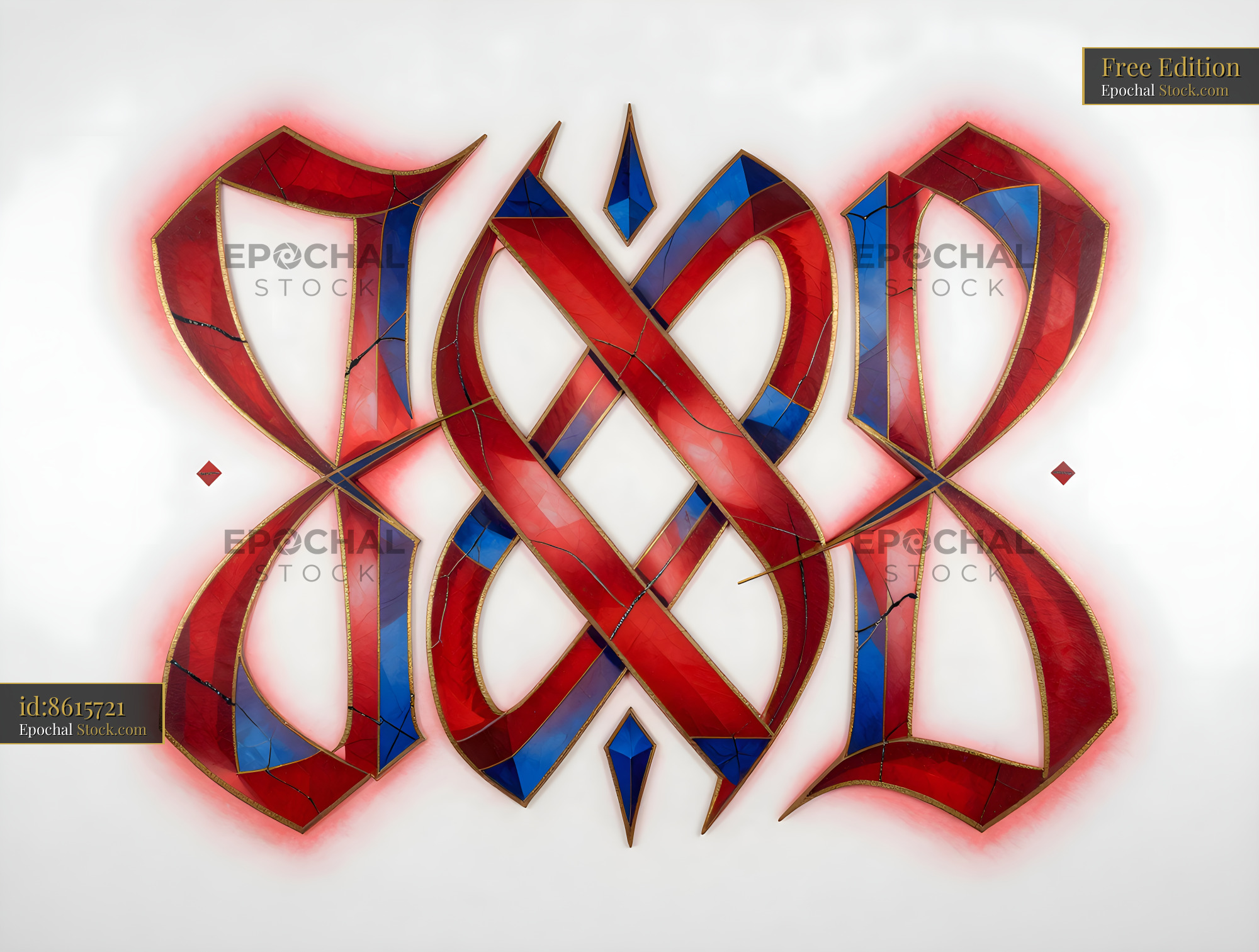 A colorful design is seen on a wall. The artwork features intertwining shapes in red and blue. The creative expression showcases a blend of colors and lines that forms an interesting pattern.
