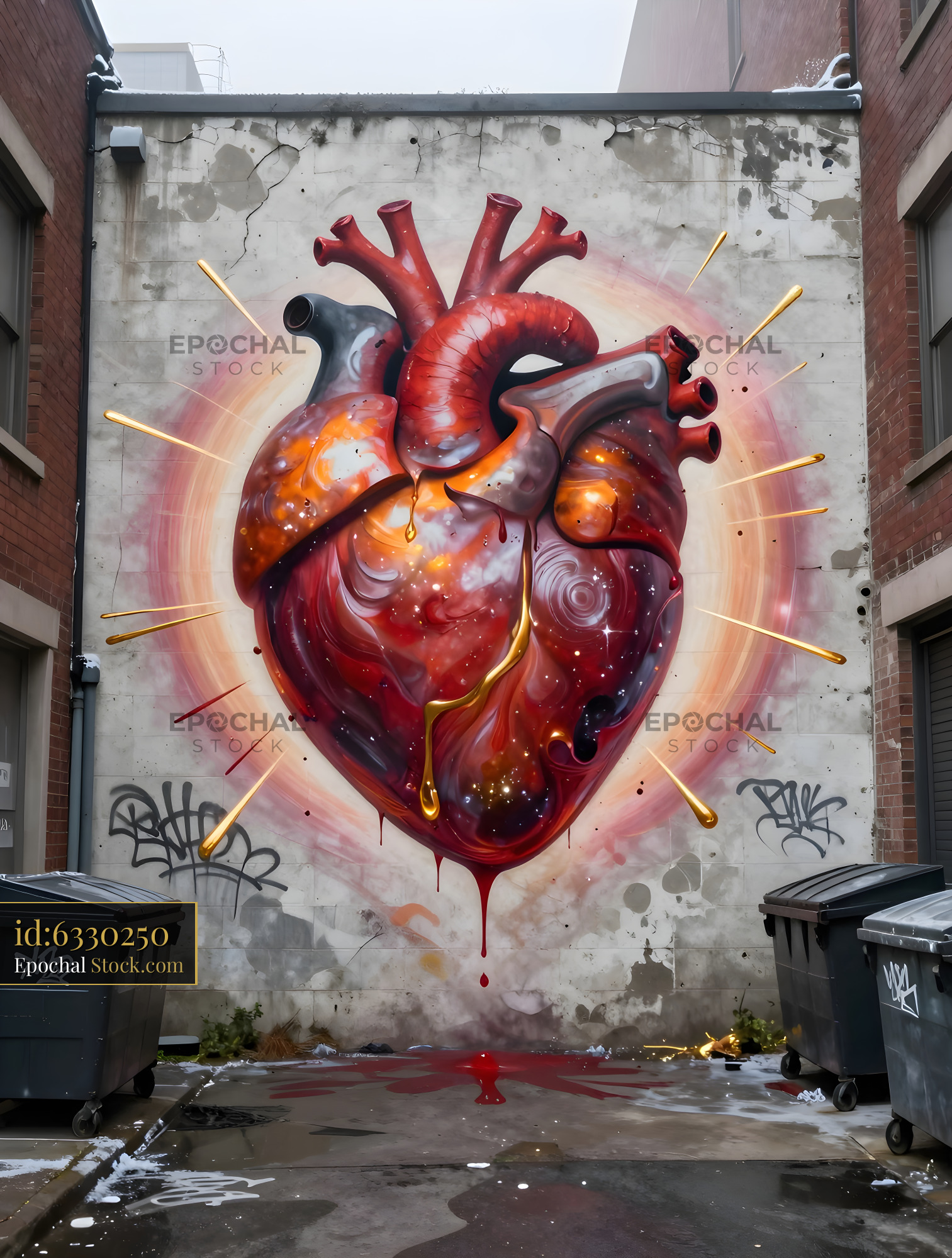 A heart mural is painted on a brick wall in an alley. The mural features bright colors and details. Trash bins are placed nearby. The scene shows an urban environment in winter.