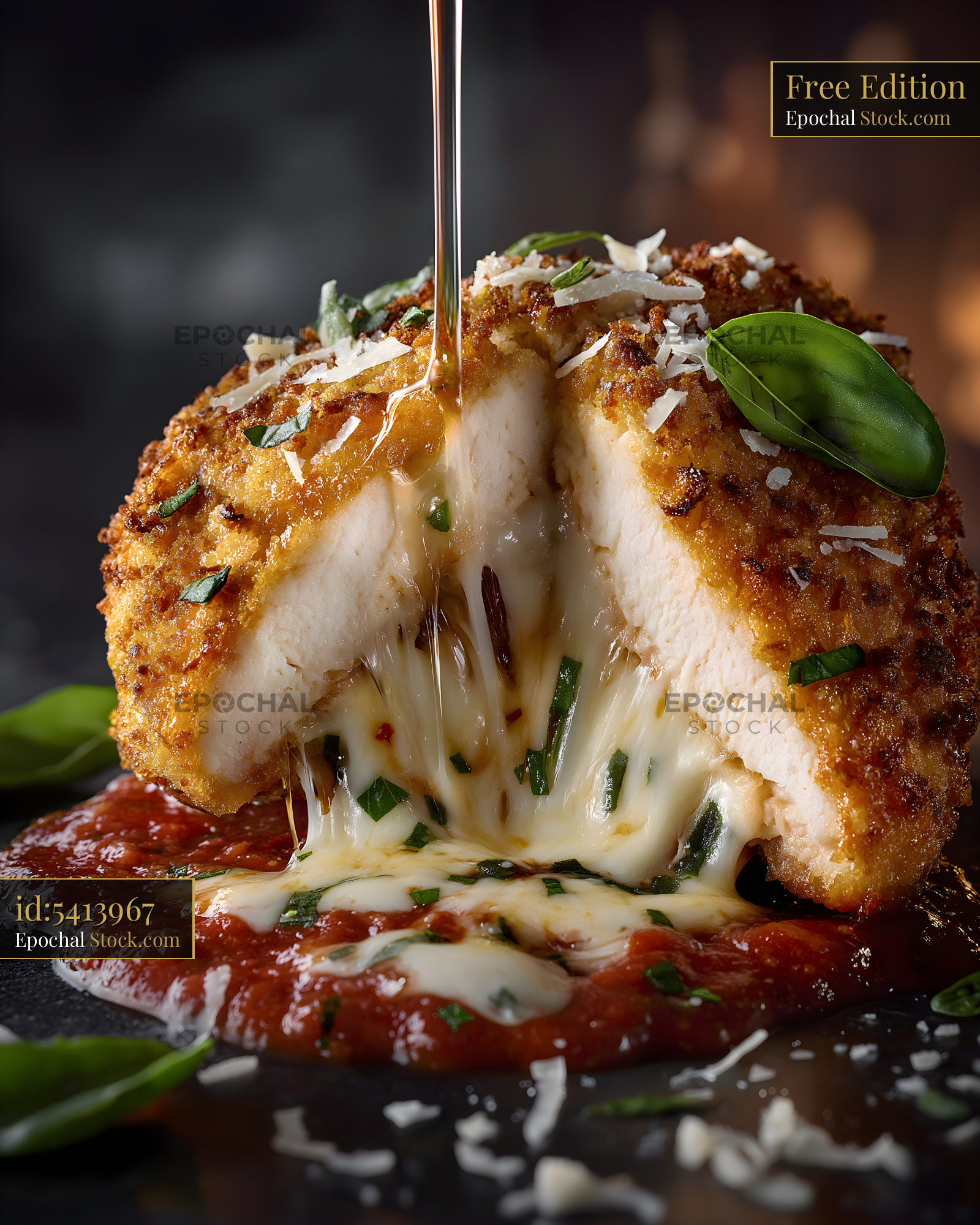 A piece of fried chicken is cut open, showing melted cheese inside. Sauce is poured over the chicken on a dark surface. Fresh basil leaves are placed around the dish.