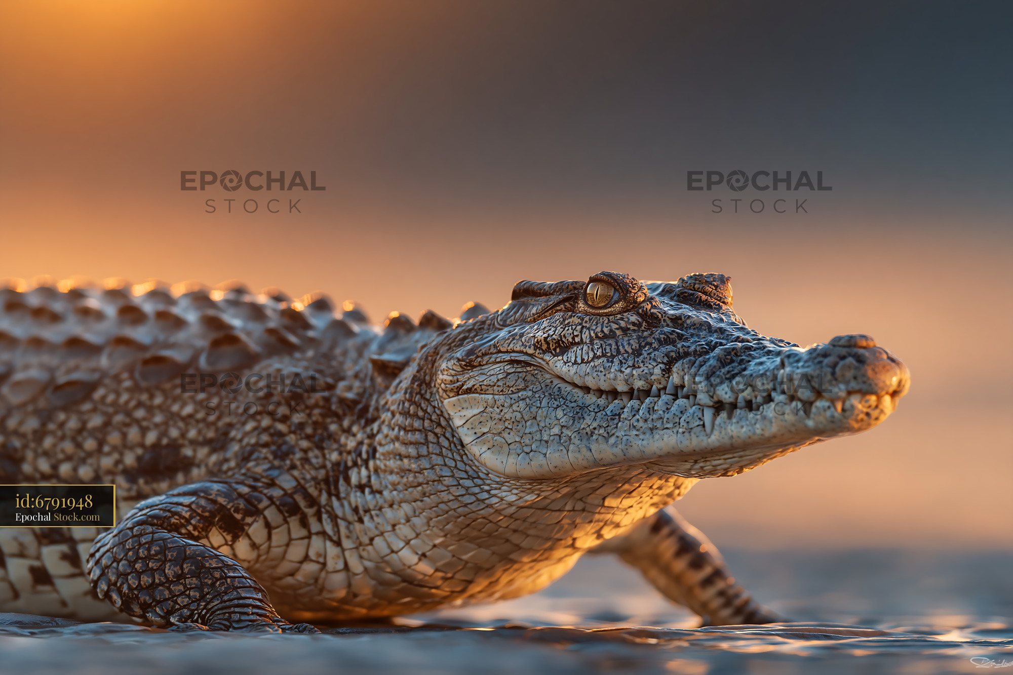 A detailed close-up of a crocodile resting in calm water at golden hour, capturing the raw power and ancient stillness of this reptilian predator in its natural habitat.