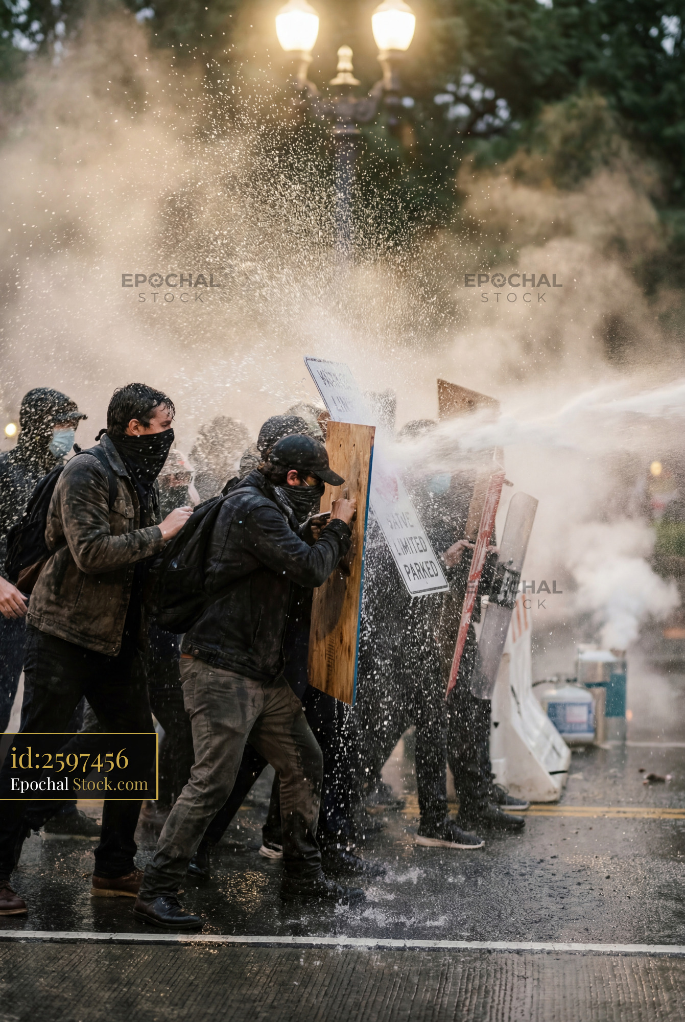 Group of people stands together in an urban area at night as water is sprayed on them. They hold signs and cover their faces. There is a mist in the air from the water.