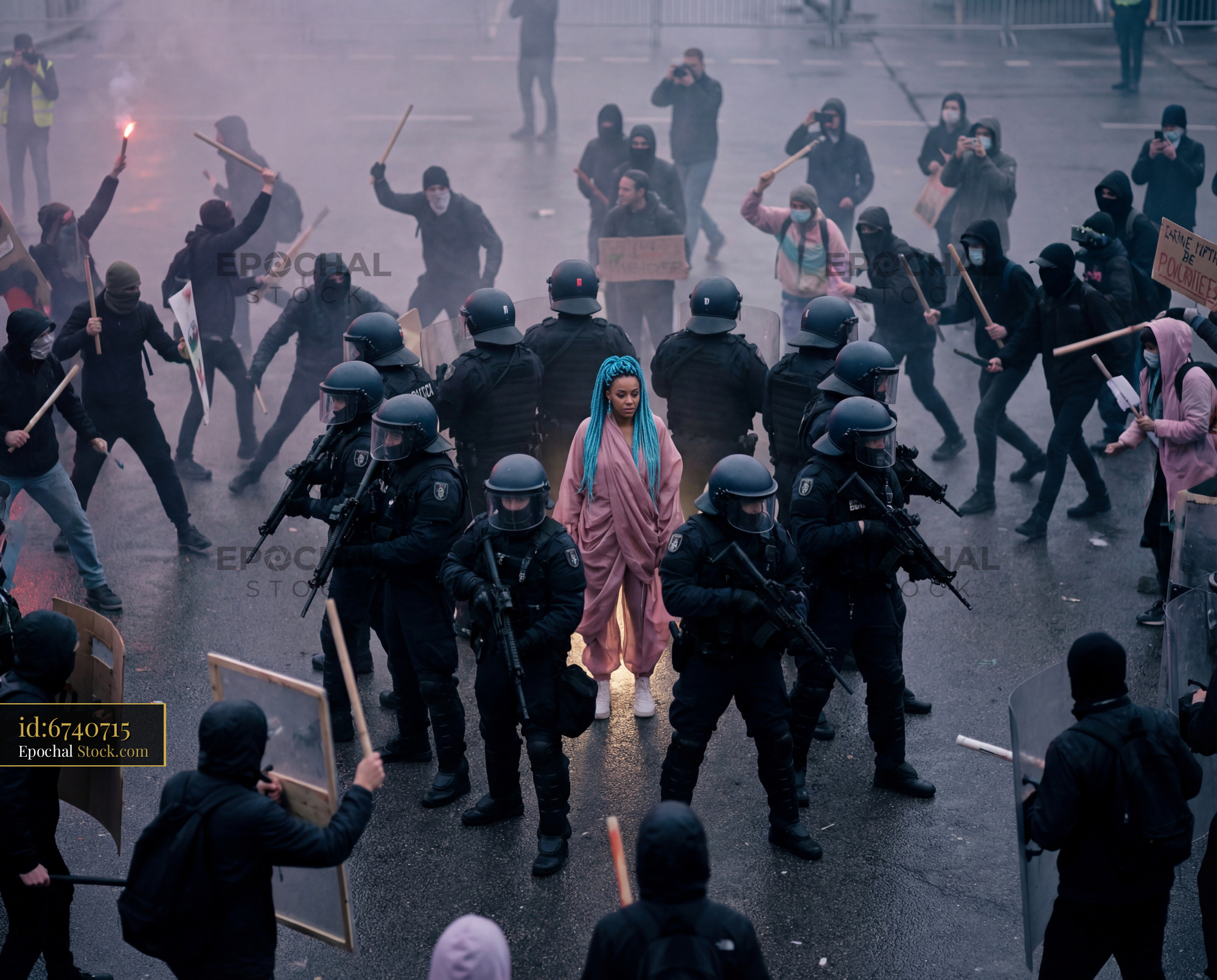 People are gathered in a city center for a protest. Some are holding signs while police form a barrier. The scene is tense with smoke and flares in the air.