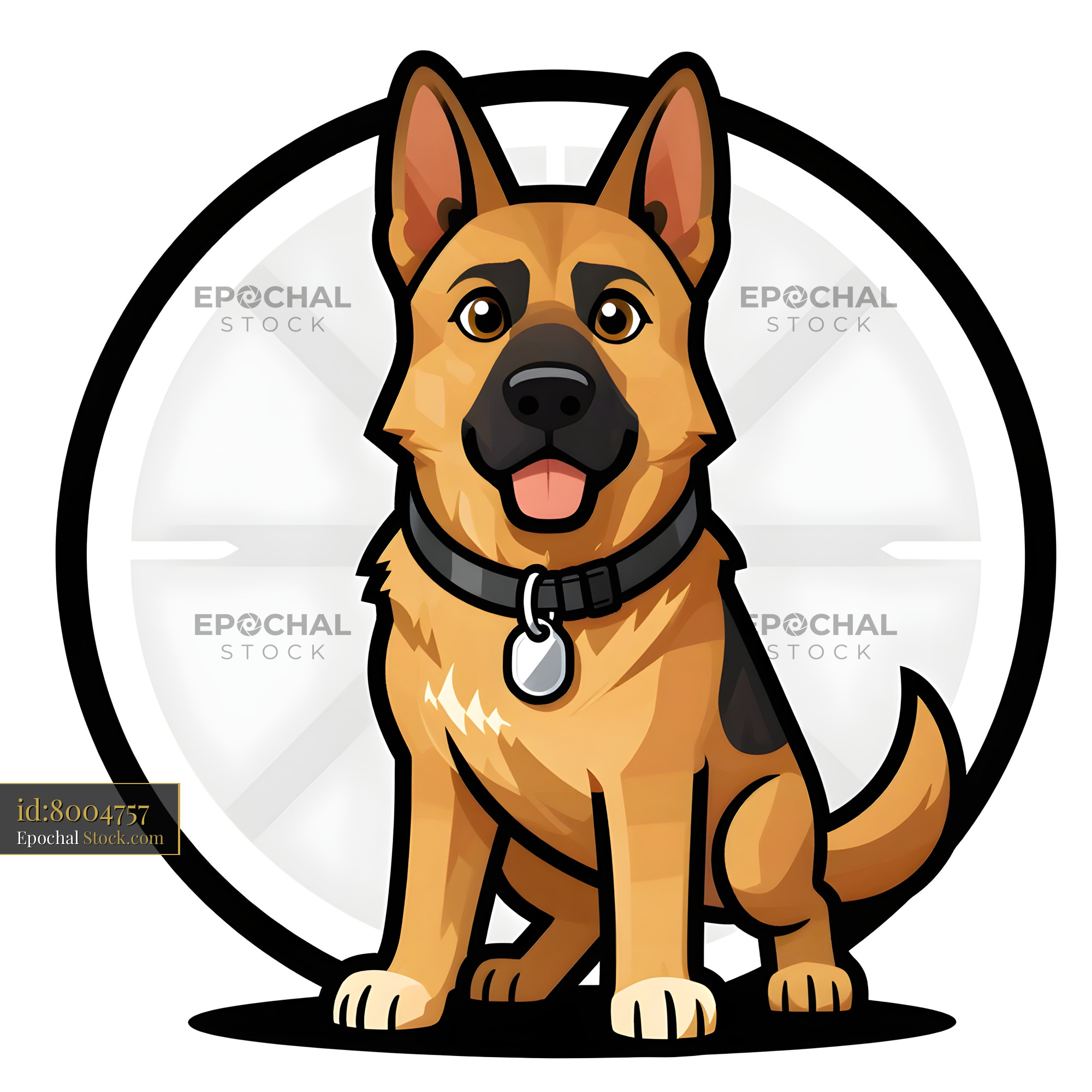 A cartoon dog sits with a happy expression. The dog has light brown fur and dark markings. It sits in front of a simple circular design. The background is plain and draws focus to the dog.